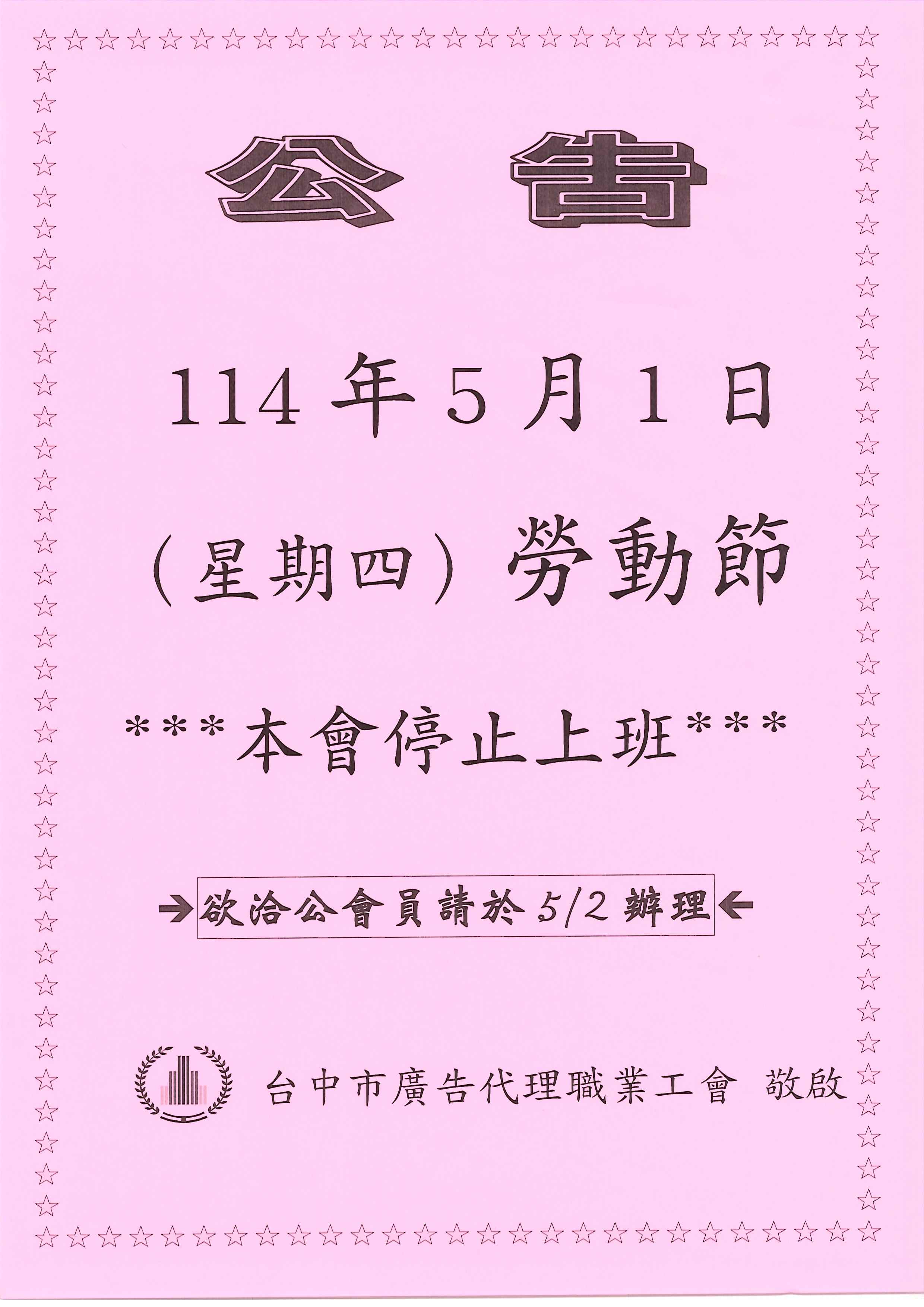 > 114.5/1(四)勞動節~工會停止上班