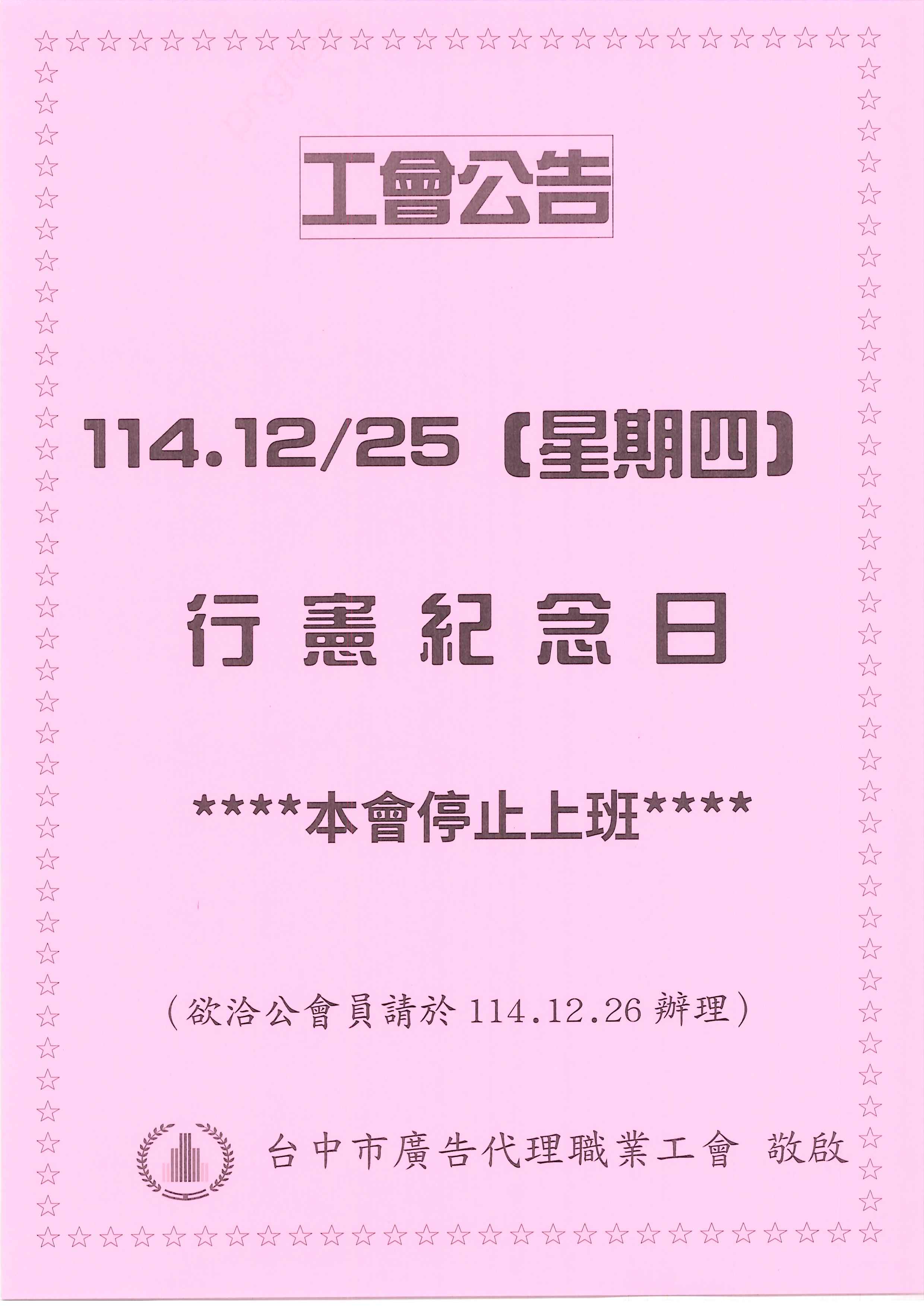 > 📢114.12.25行憲紀念日~停止上班
