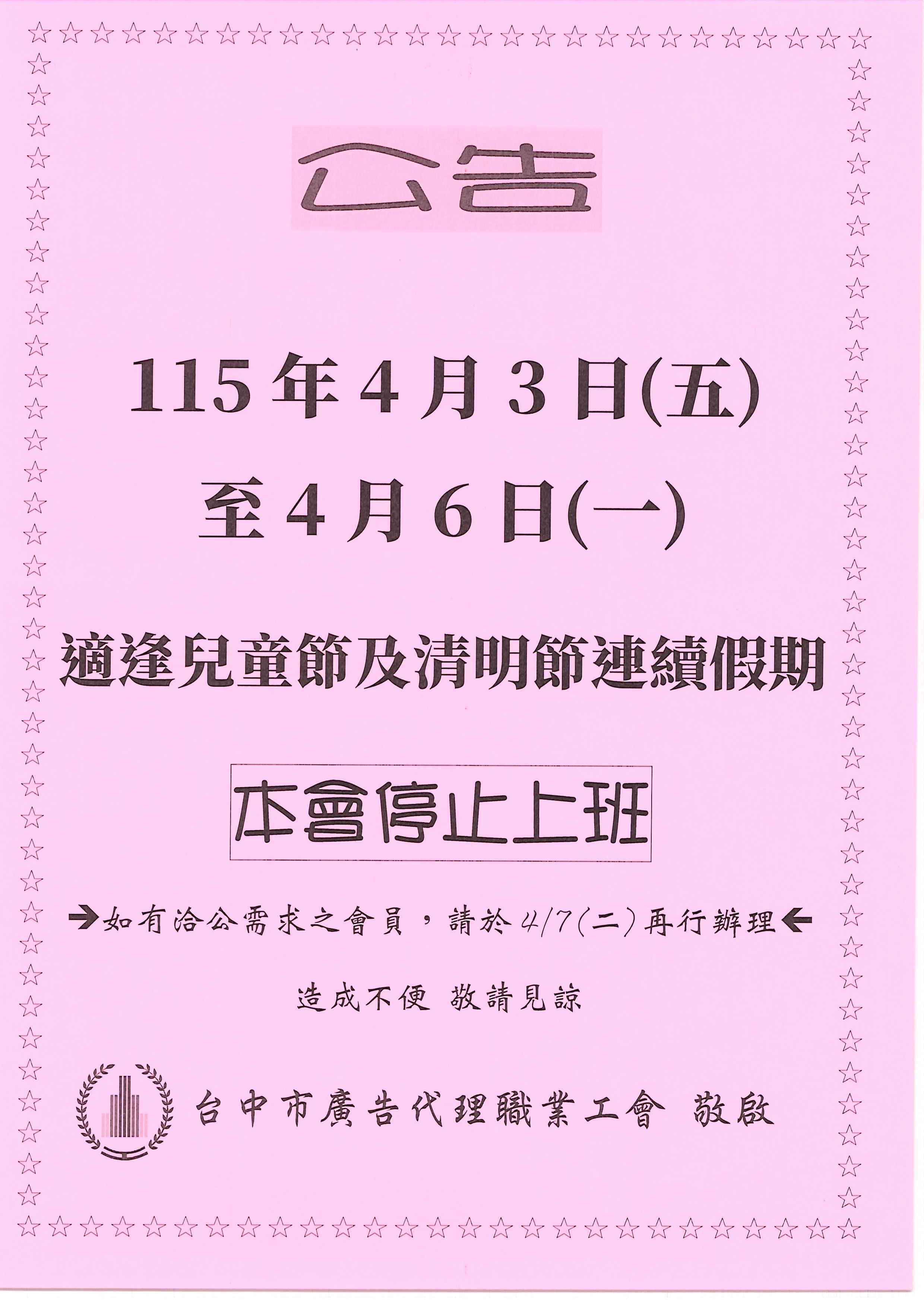 > 📢115.4.3-4.6適逢兒童節及清明節連假~工會停止上班