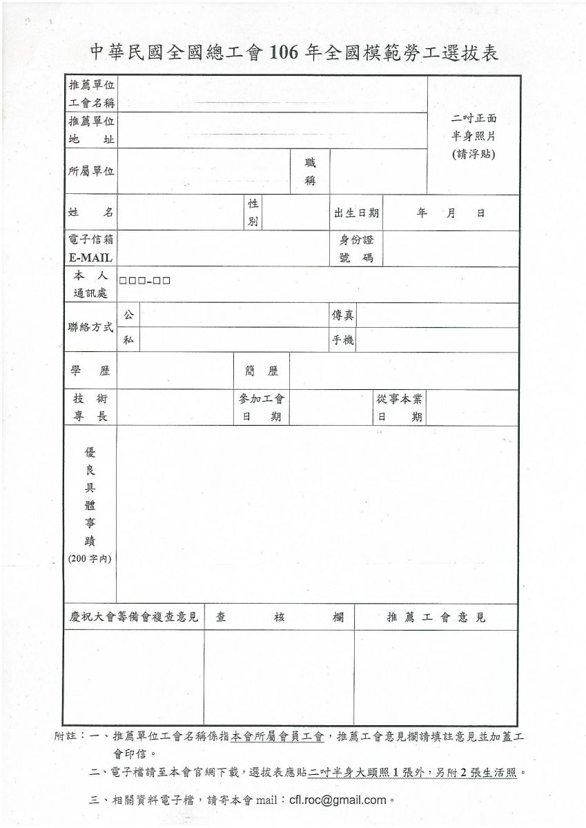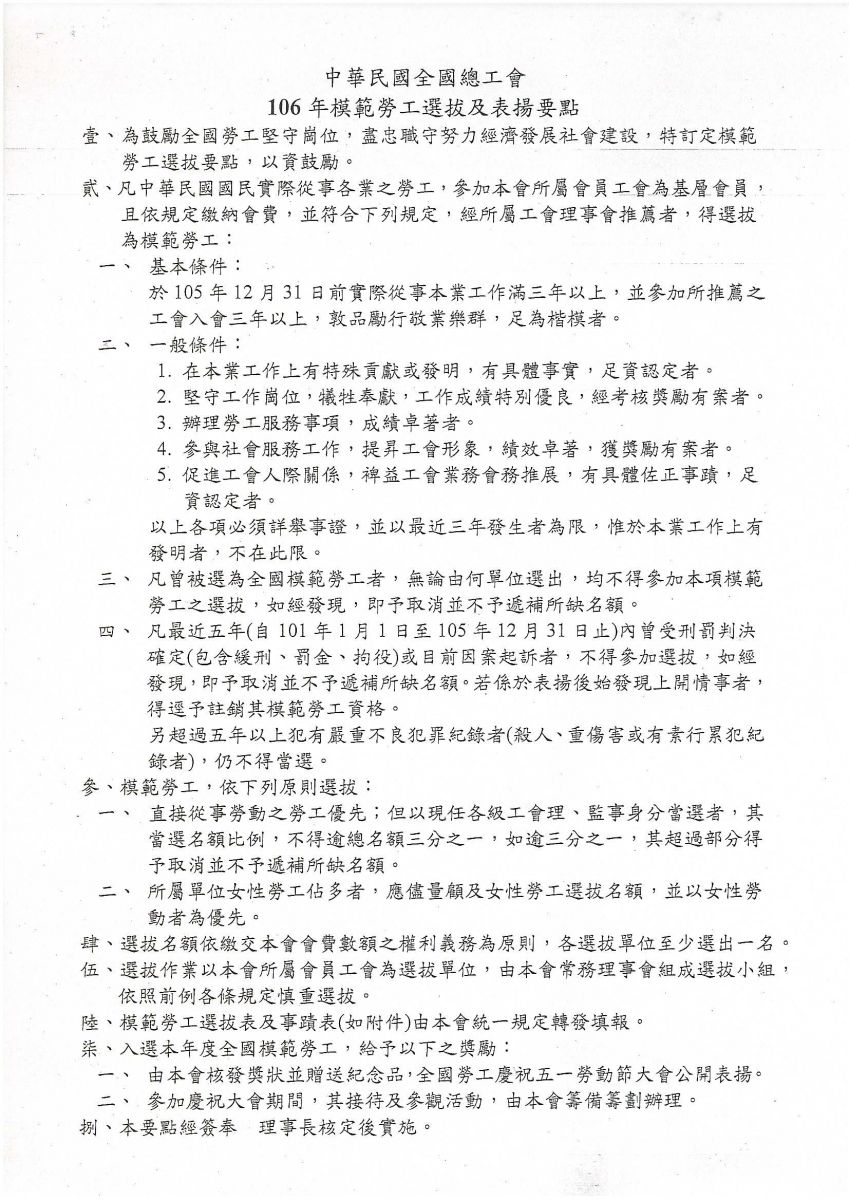 函轉中華民國全國總工會辦理(106年度全國模範勞工選拔)活動