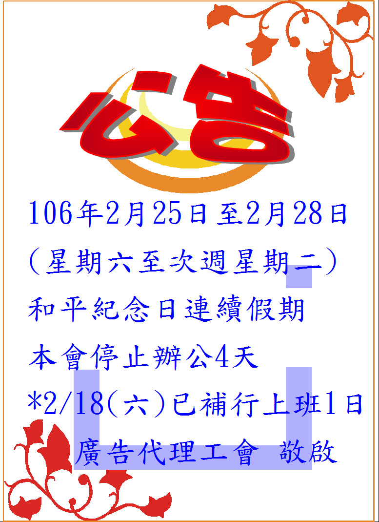 106.2.25-106.2.28和平紀念日連續假期停止上班!!