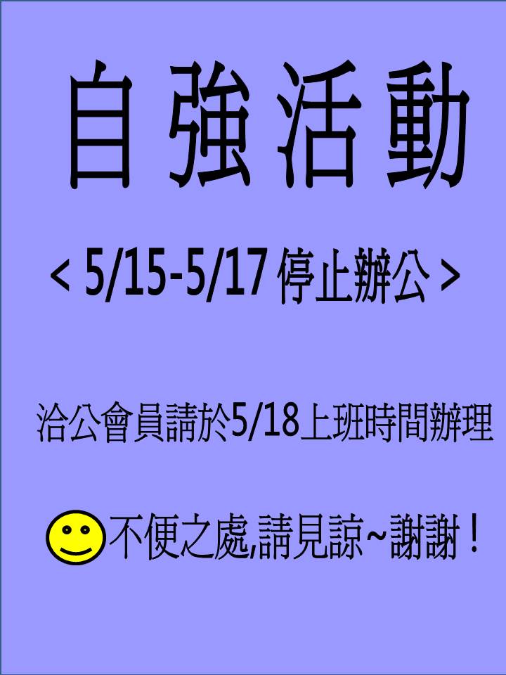 舉辦會員國外自強活動5/15(一)至5/17(三)工會停止辦公~不便之處.敬請見諒!!