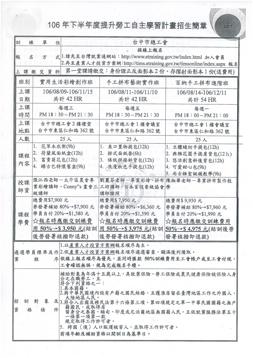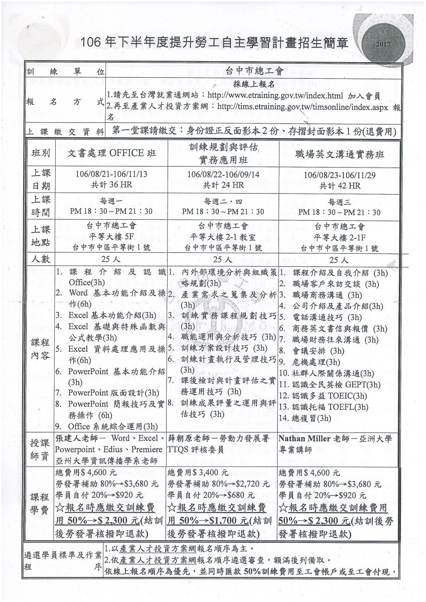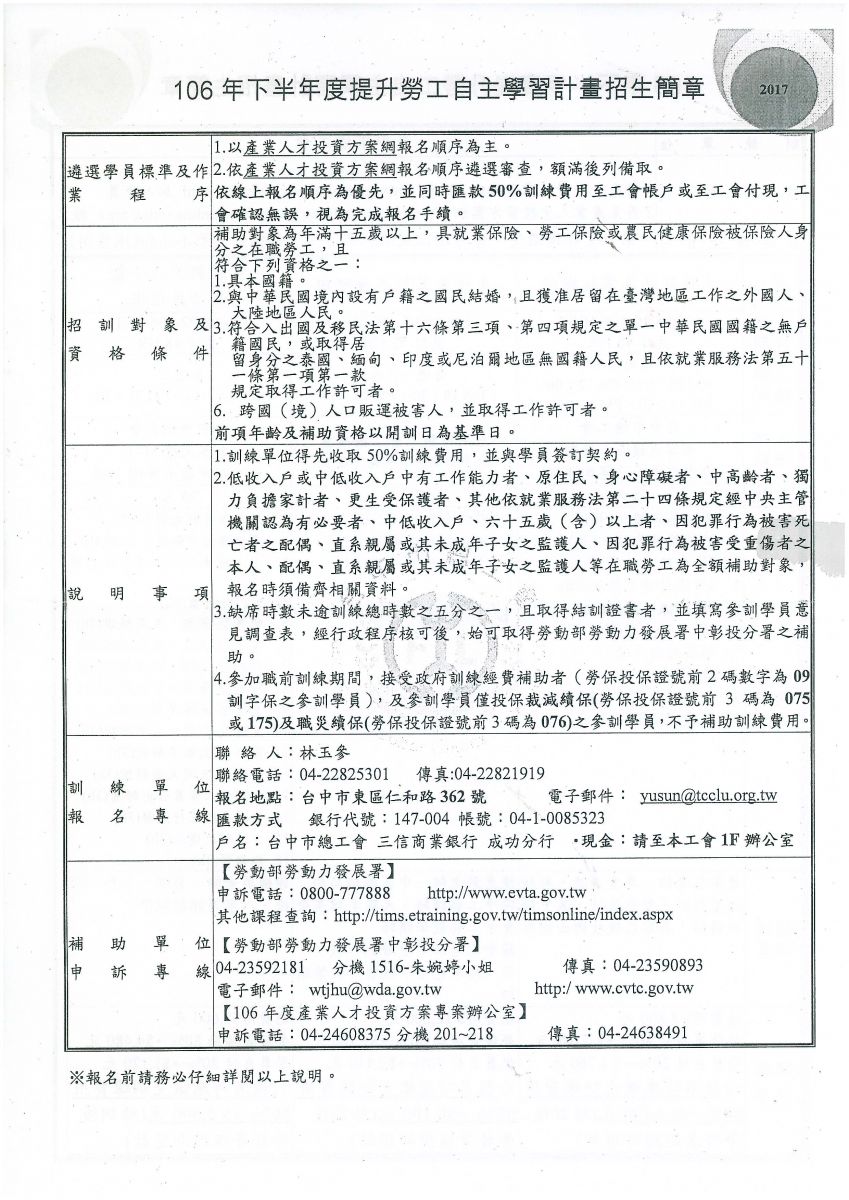 > 轉知~台中市總工會辦理『106年下半年為提升勞工自主學習計畫』請會員踴躍報名。