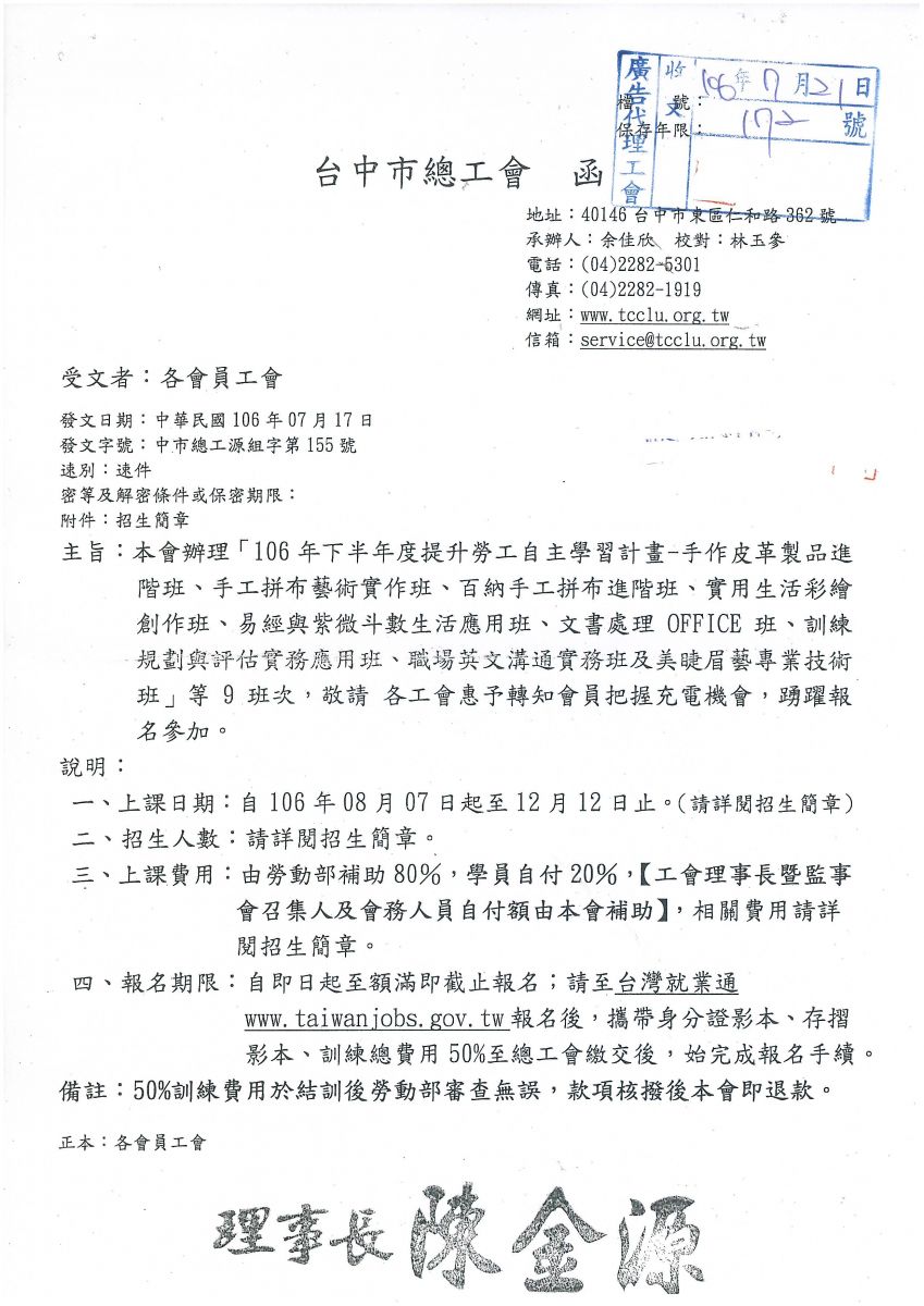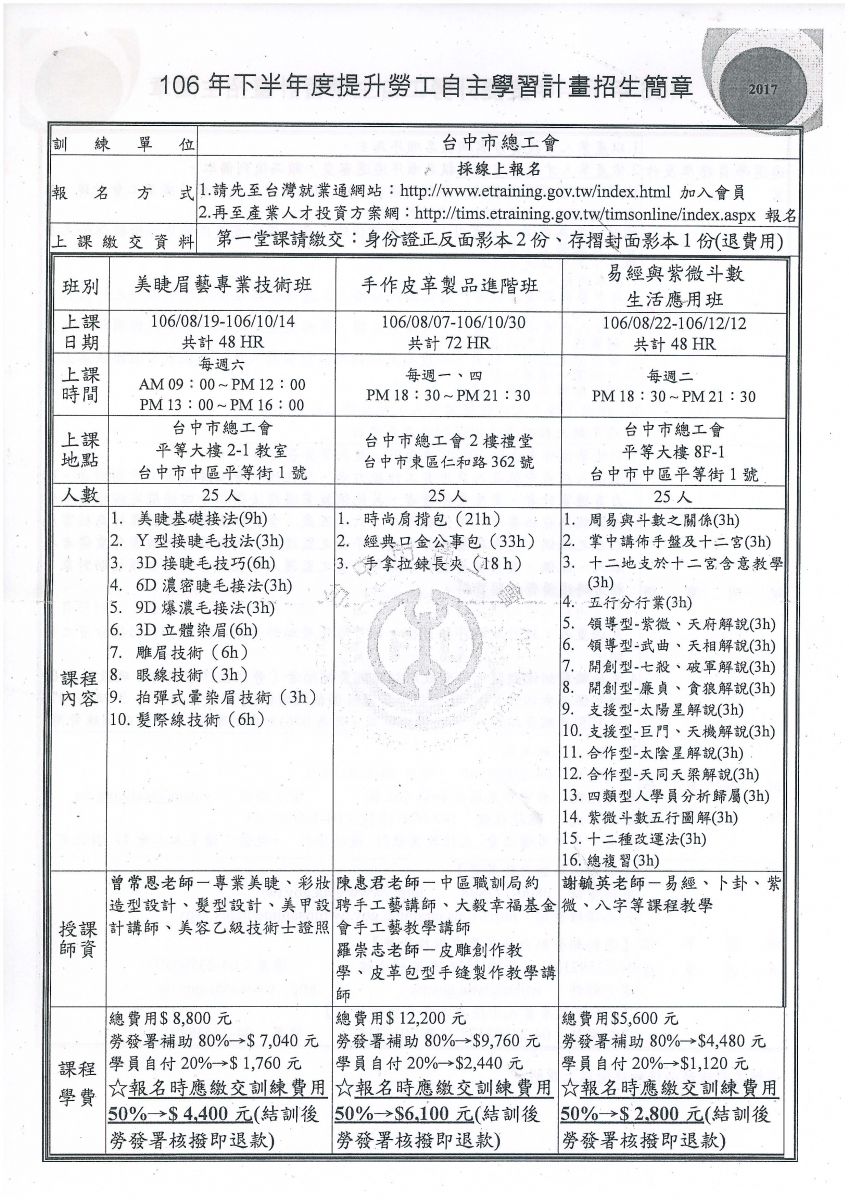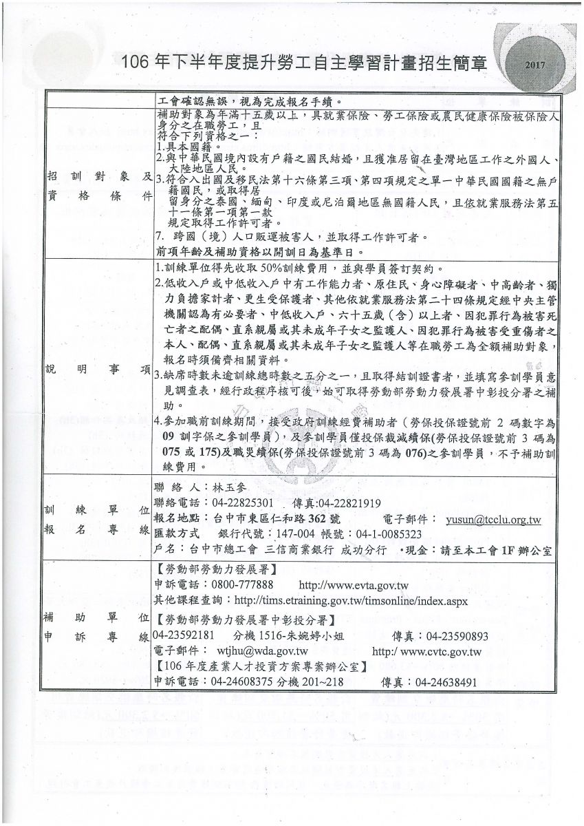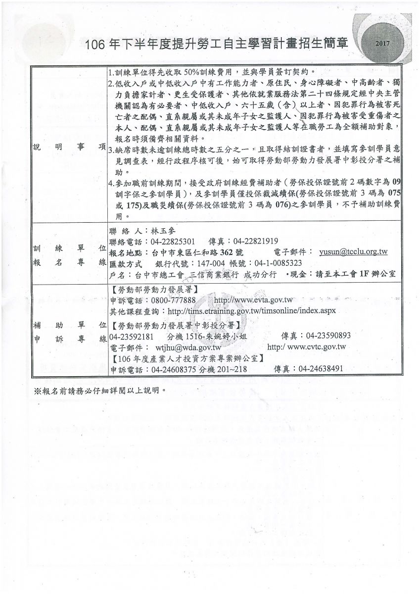 > 轉知~台中市總工會辦理『106年下半年為提升勞工自主學習計畫』請會員踴躍報名。