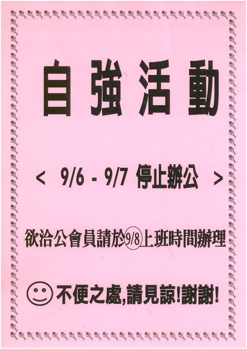 公告:106年9月6日-9月7日(三.四)舉辦會員國內自強活動~停止辦公二日