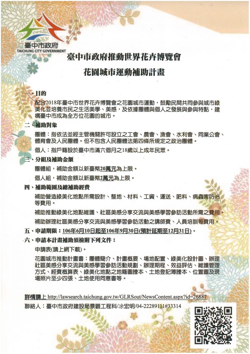 轉貼~市政府推動世界花博花園城市運動補助計畫