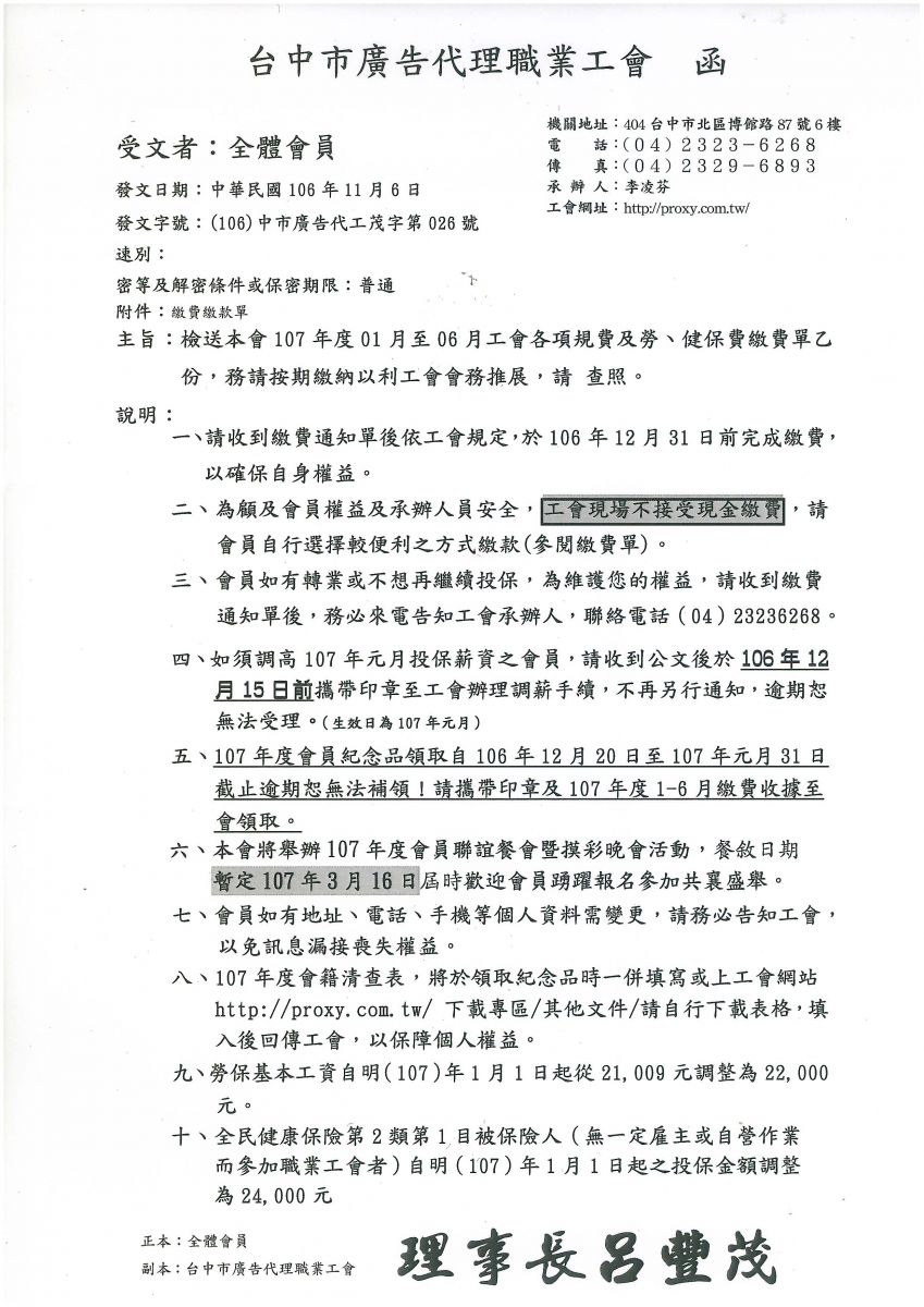 > 請會員們注意:107年1-6月繳費通知公文已寄出