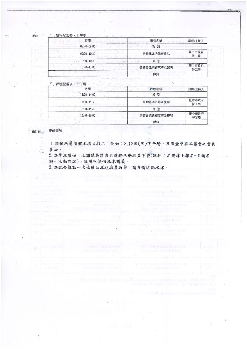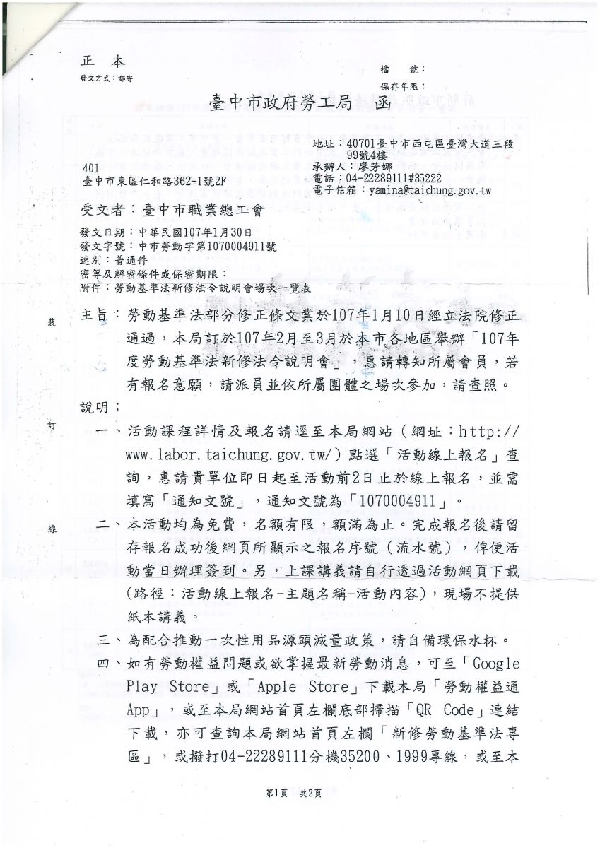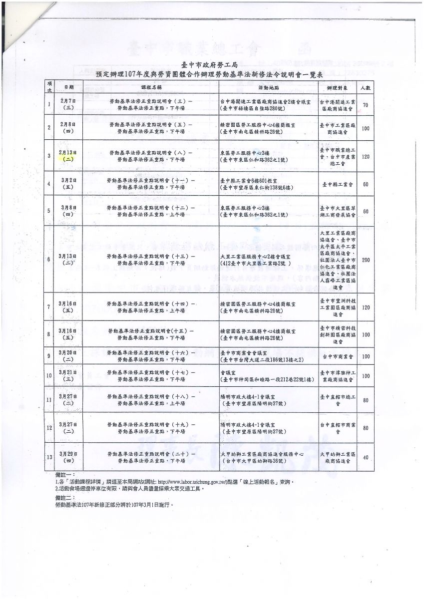 > 函轉市府勞工局於各地區舉辦「107年度勞基法新修法令說明會」