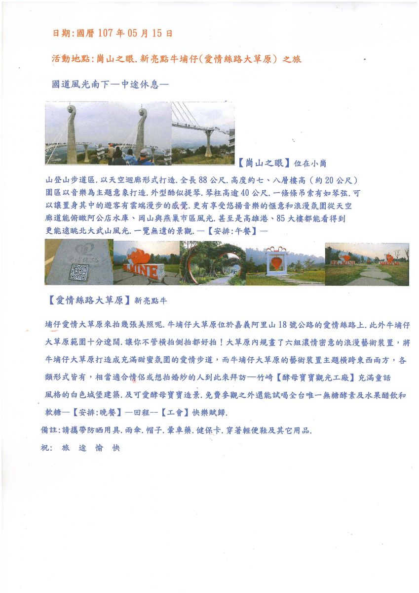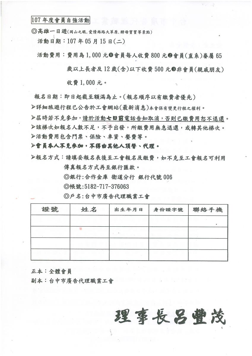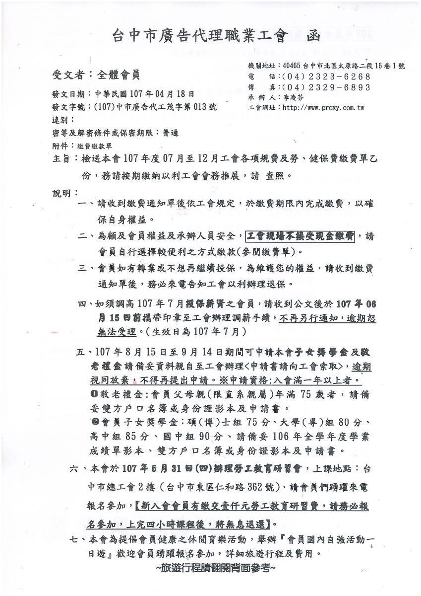 請會員們注意:近期內將寄發107年7-12月繳費通知公文(旅遊行程表請參閱)