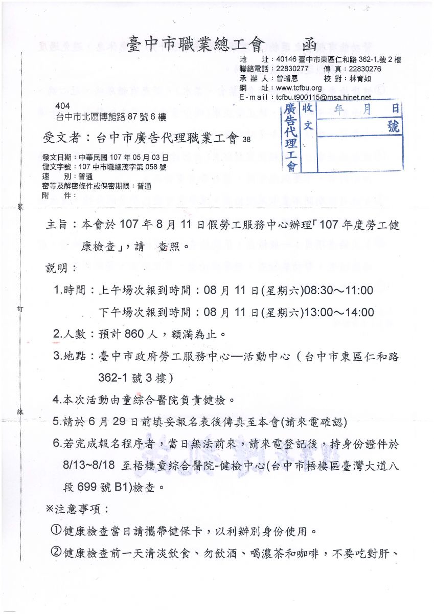 函轉~臺中市職業總工會辦理107年度勞工健康檢查