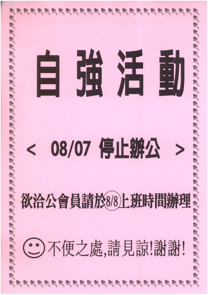 > 107年8月7日(二)舉辦會員自強活動一日遊,停止辦公!!