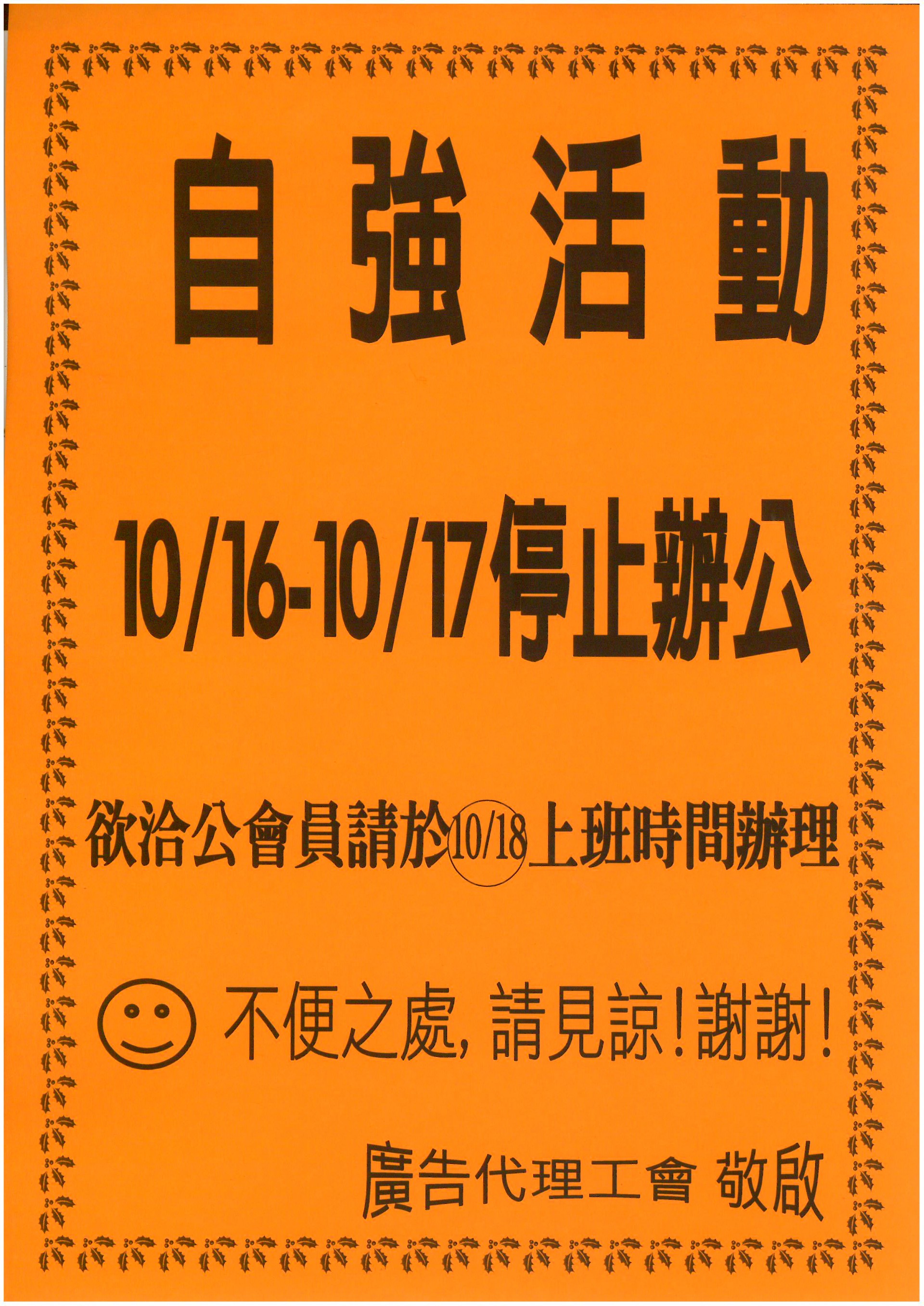 107年10月16日-10月17日(二.三)舉辦會員自強活動兩日遊,停止辦公!!