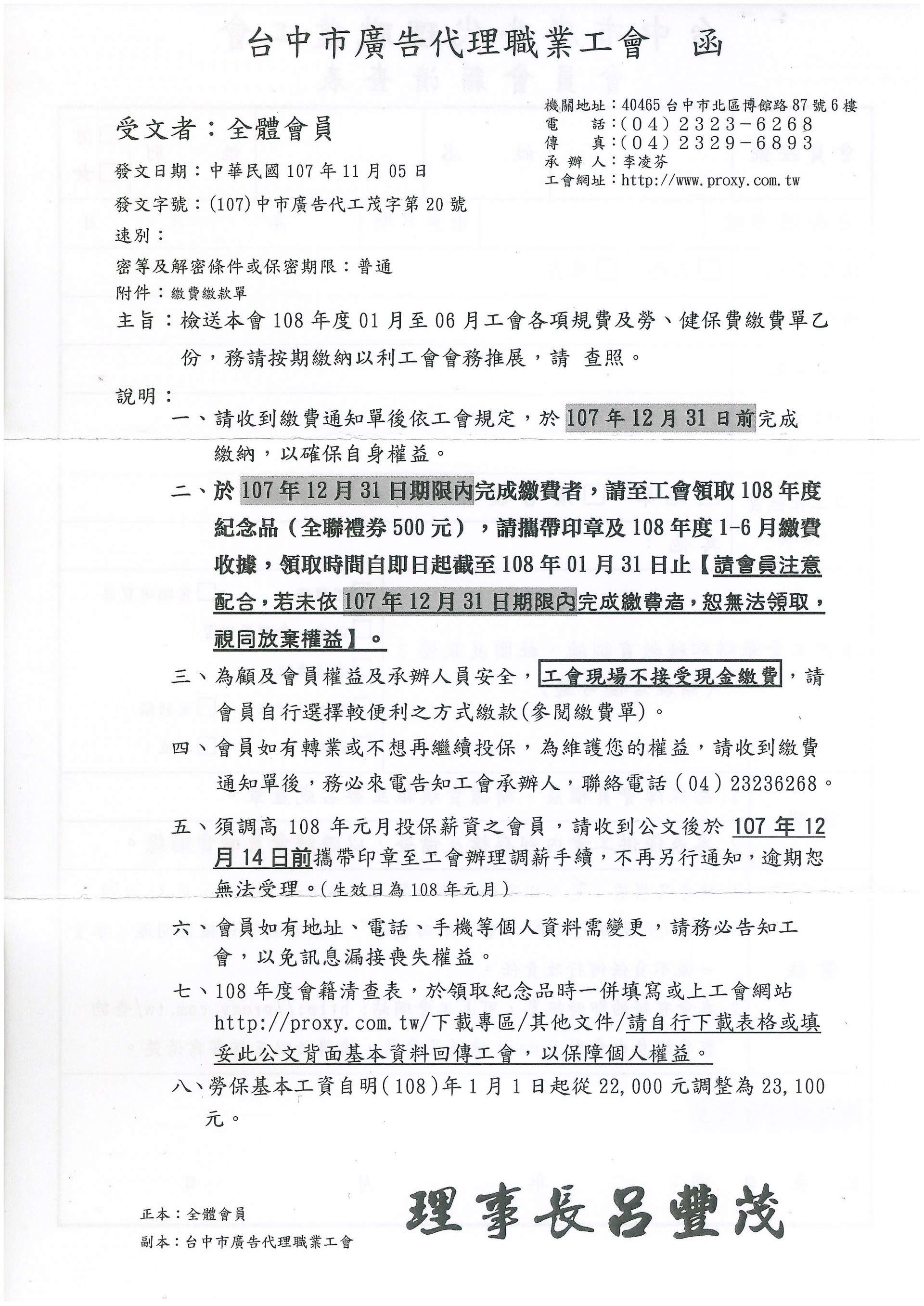 108年1-6月繳費公文已陸續寄出,請會員們詳閱!!