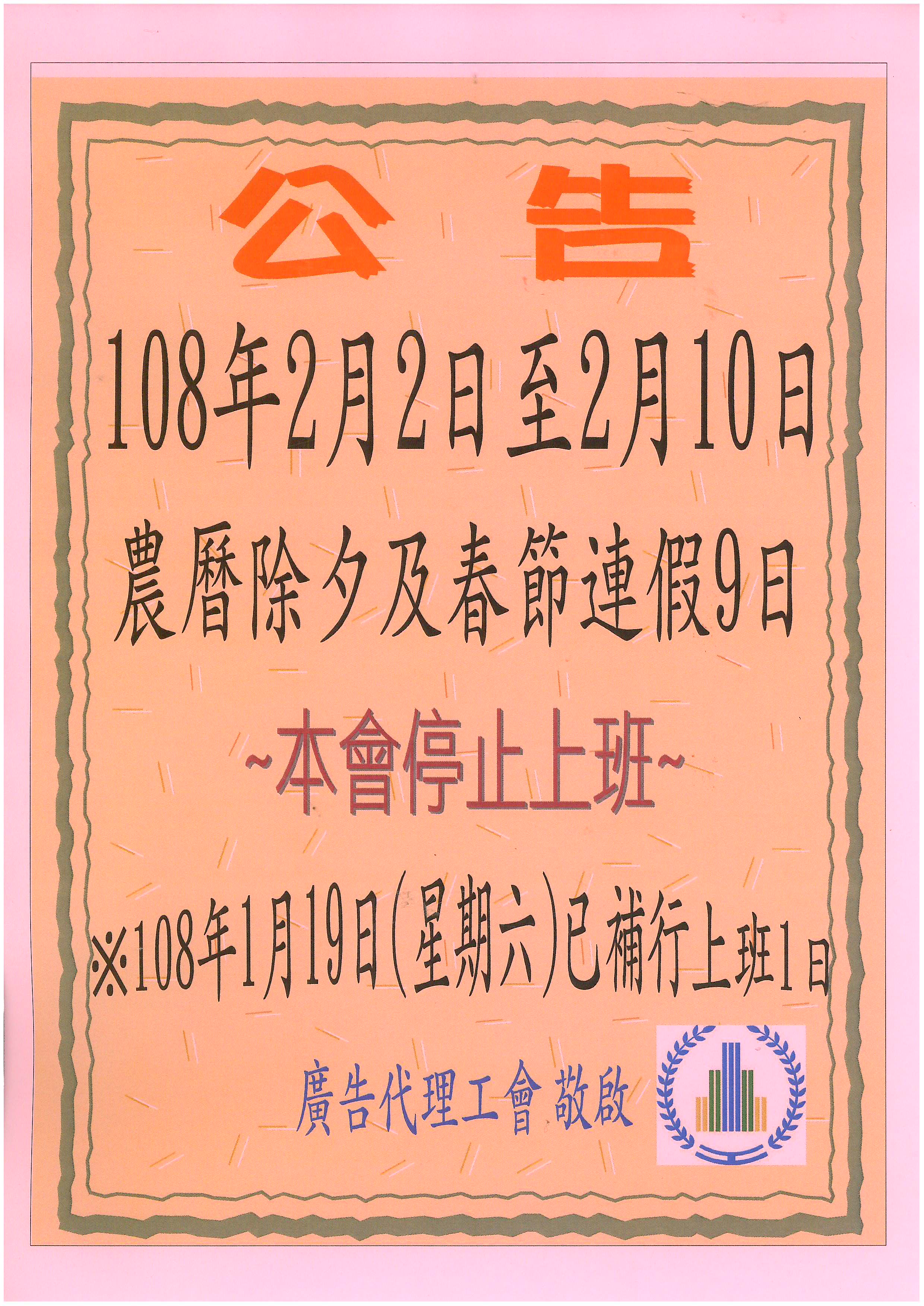108年2月2日至2月10日農曆除夕及春節連續假期,停止上班!!