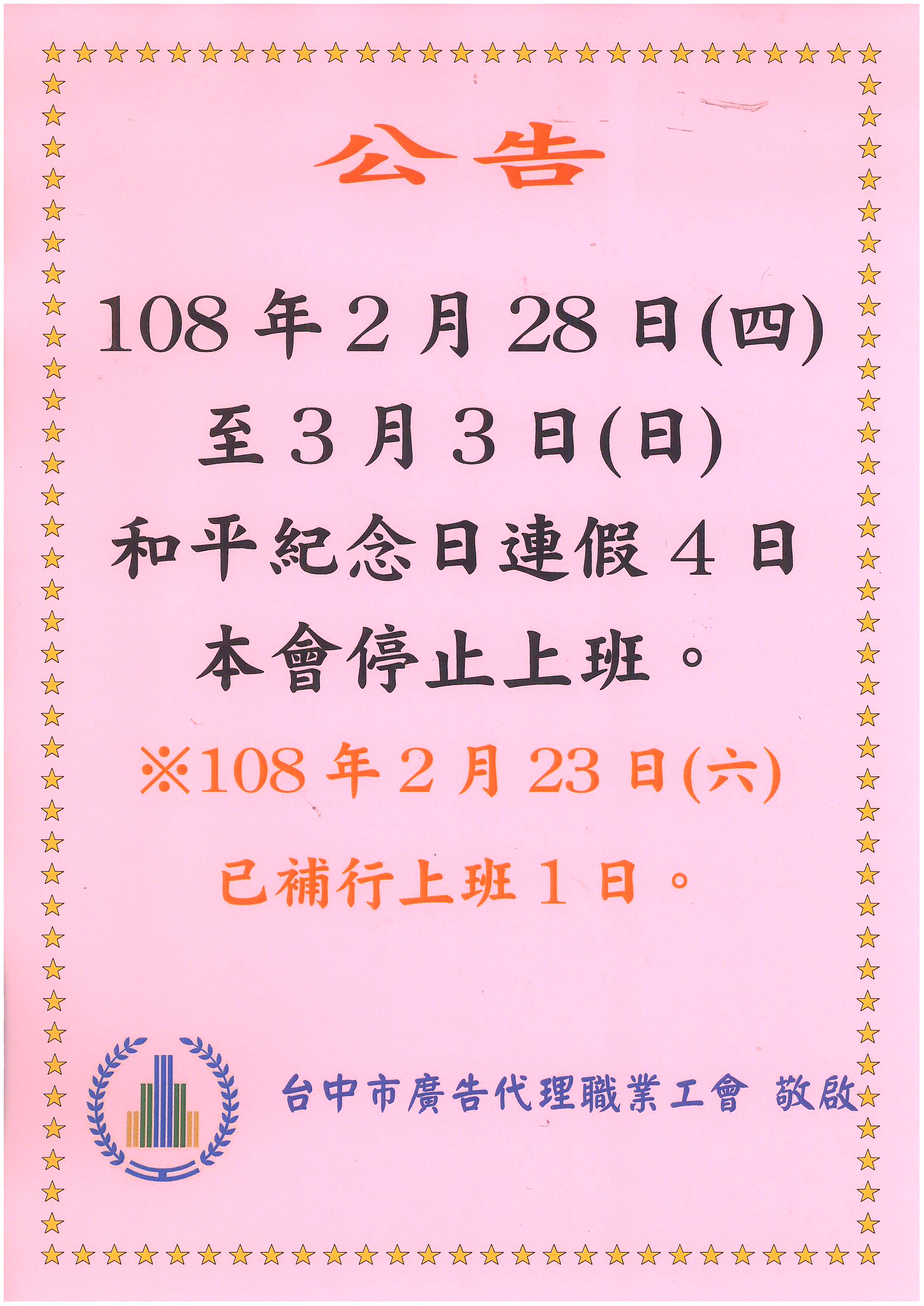 108年2月28日至3月3日和平紀念日連假,停止上班!!
