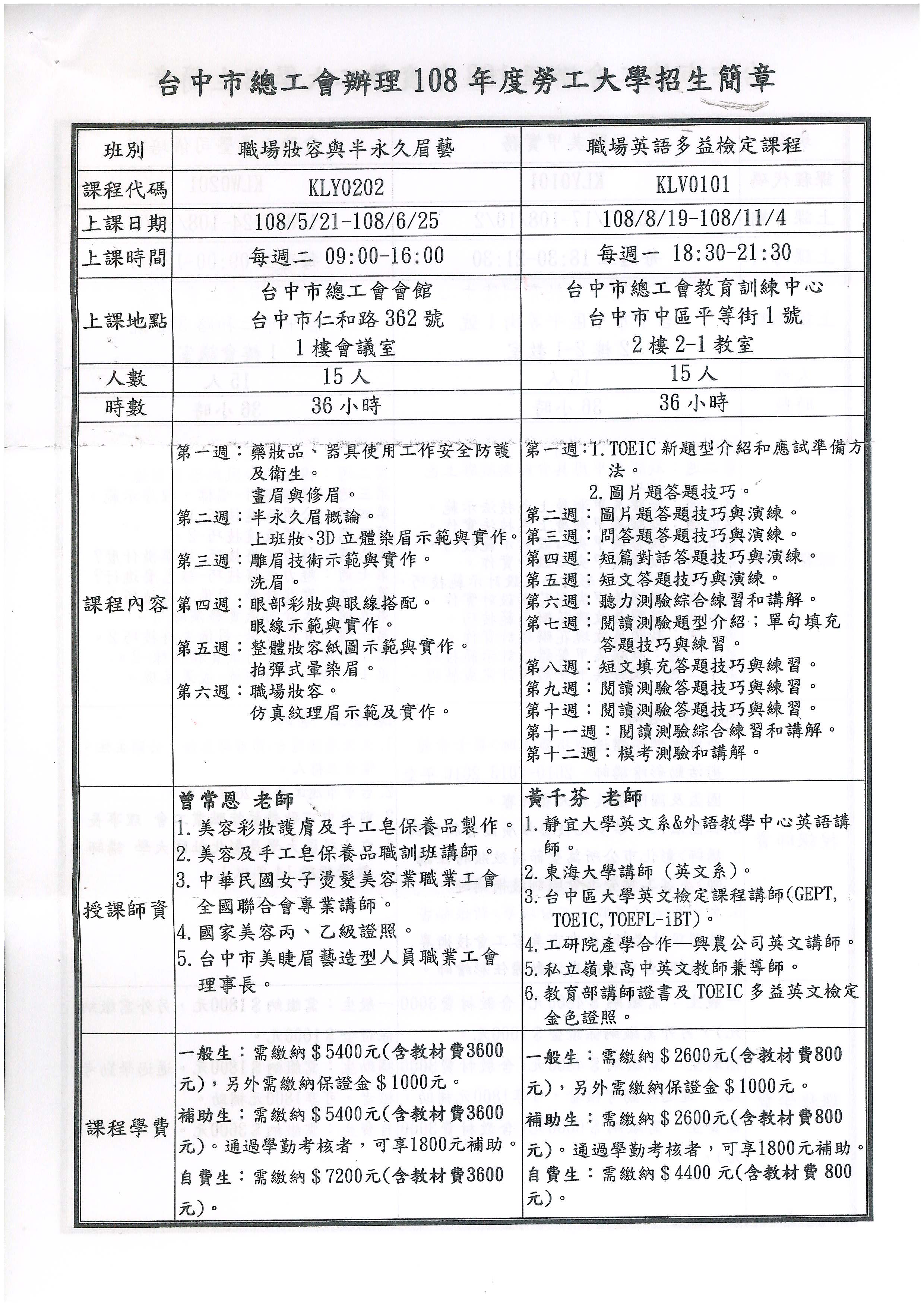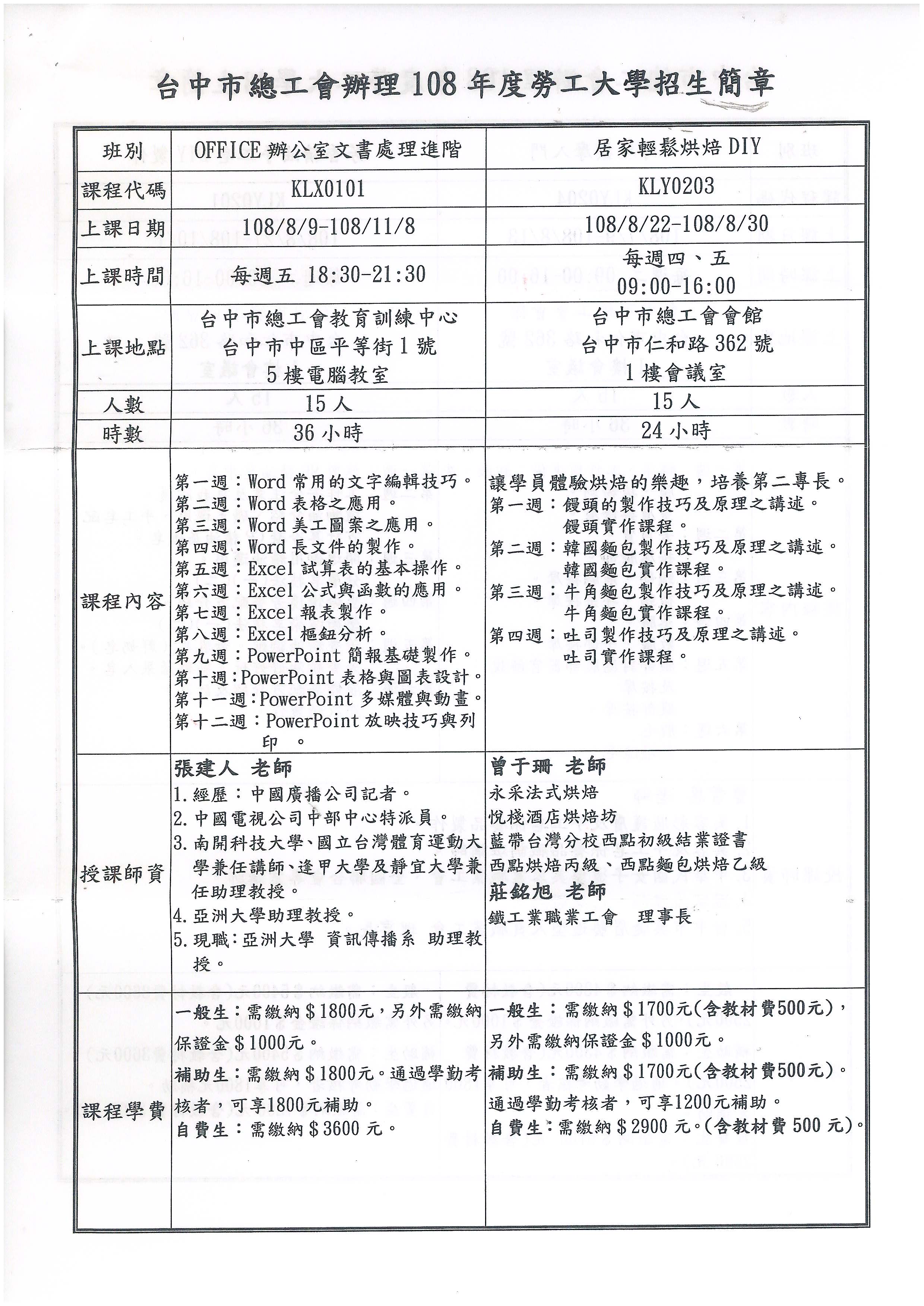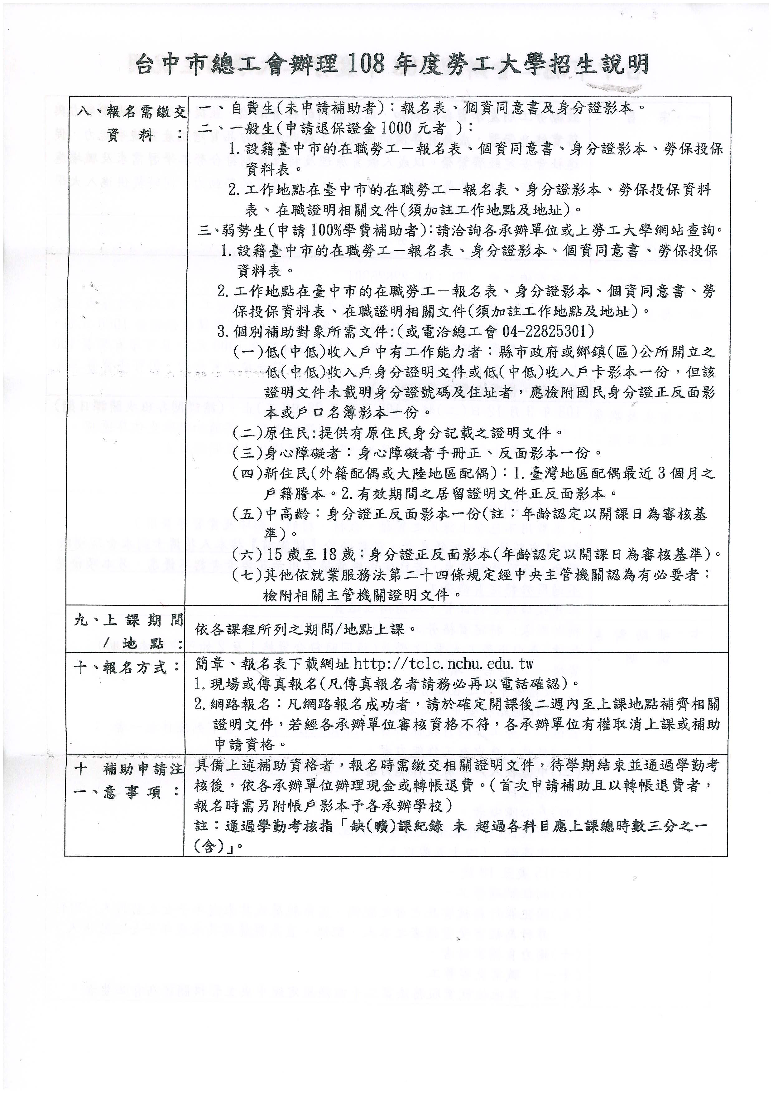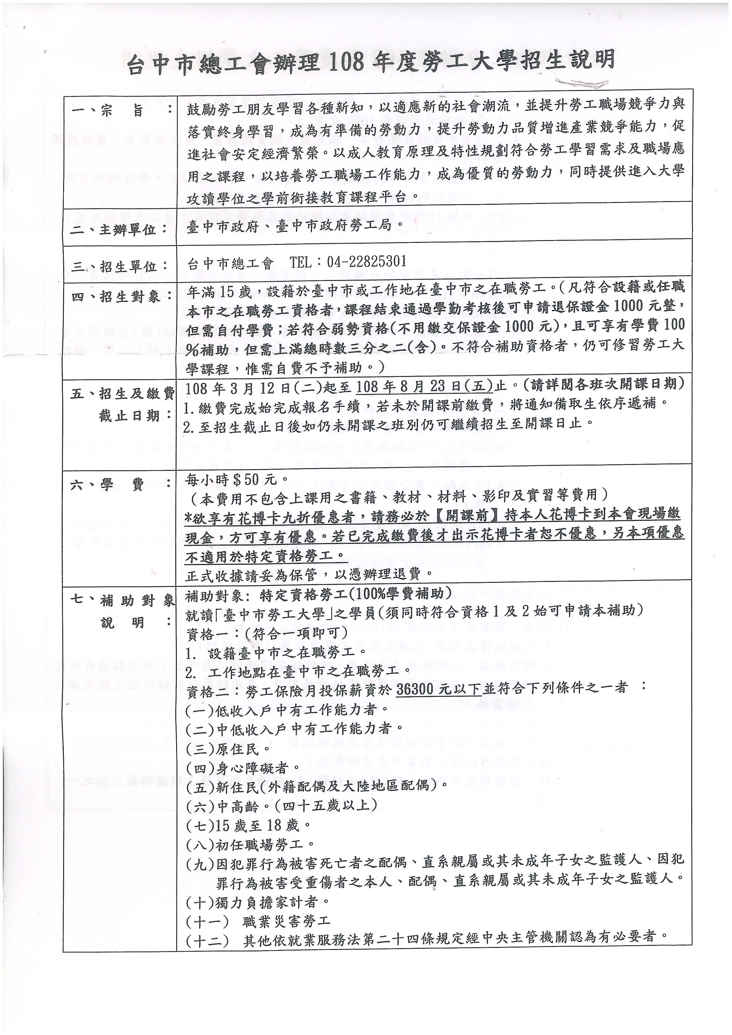 轉知~總工會辦理(108年度台中勞工大學)招生說明及簡章,敬請會員踴躍報名!!