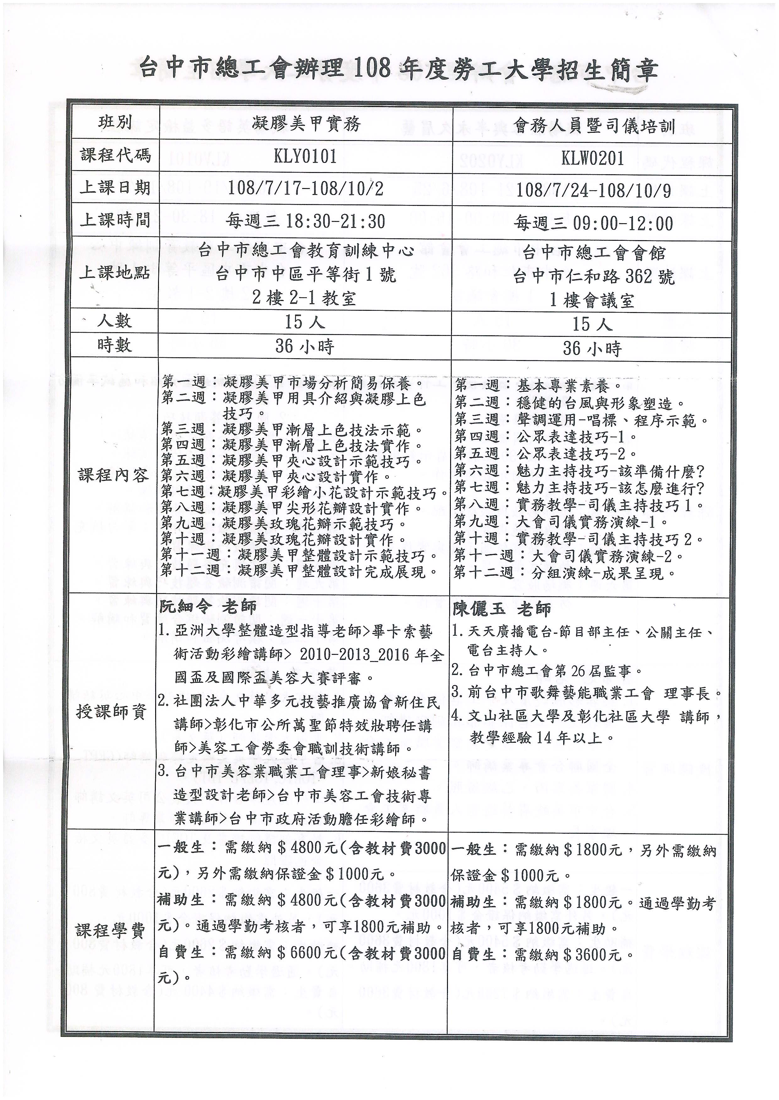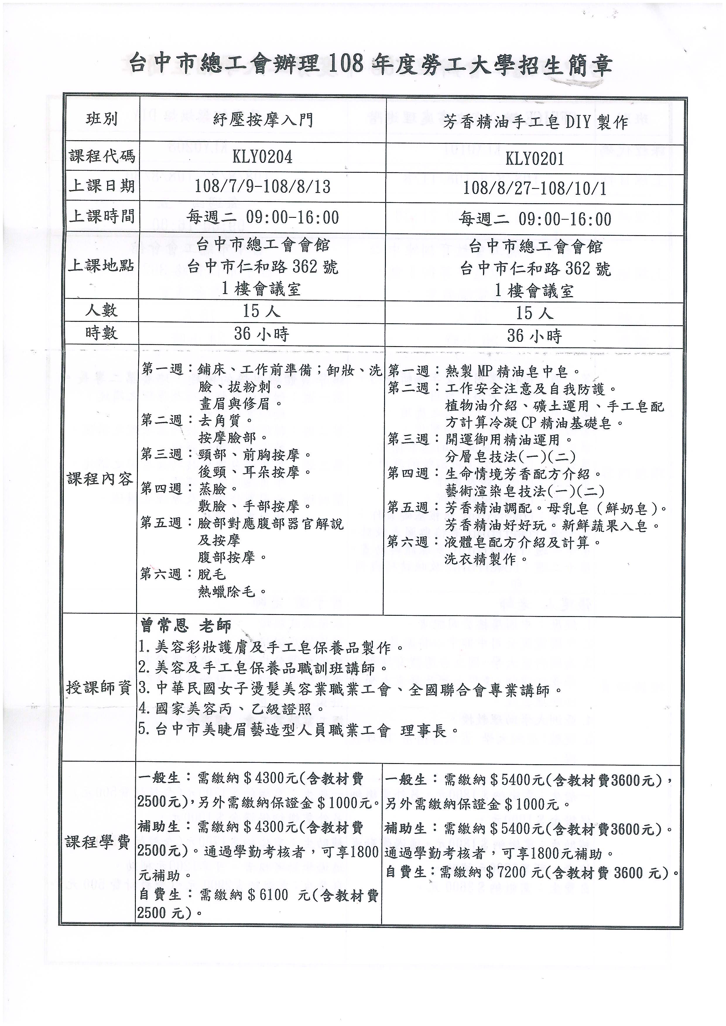 > 轉知~總工會辦理(108年度台中勞工大學)招生說明及簡章,敬請會員踴躍報名!!