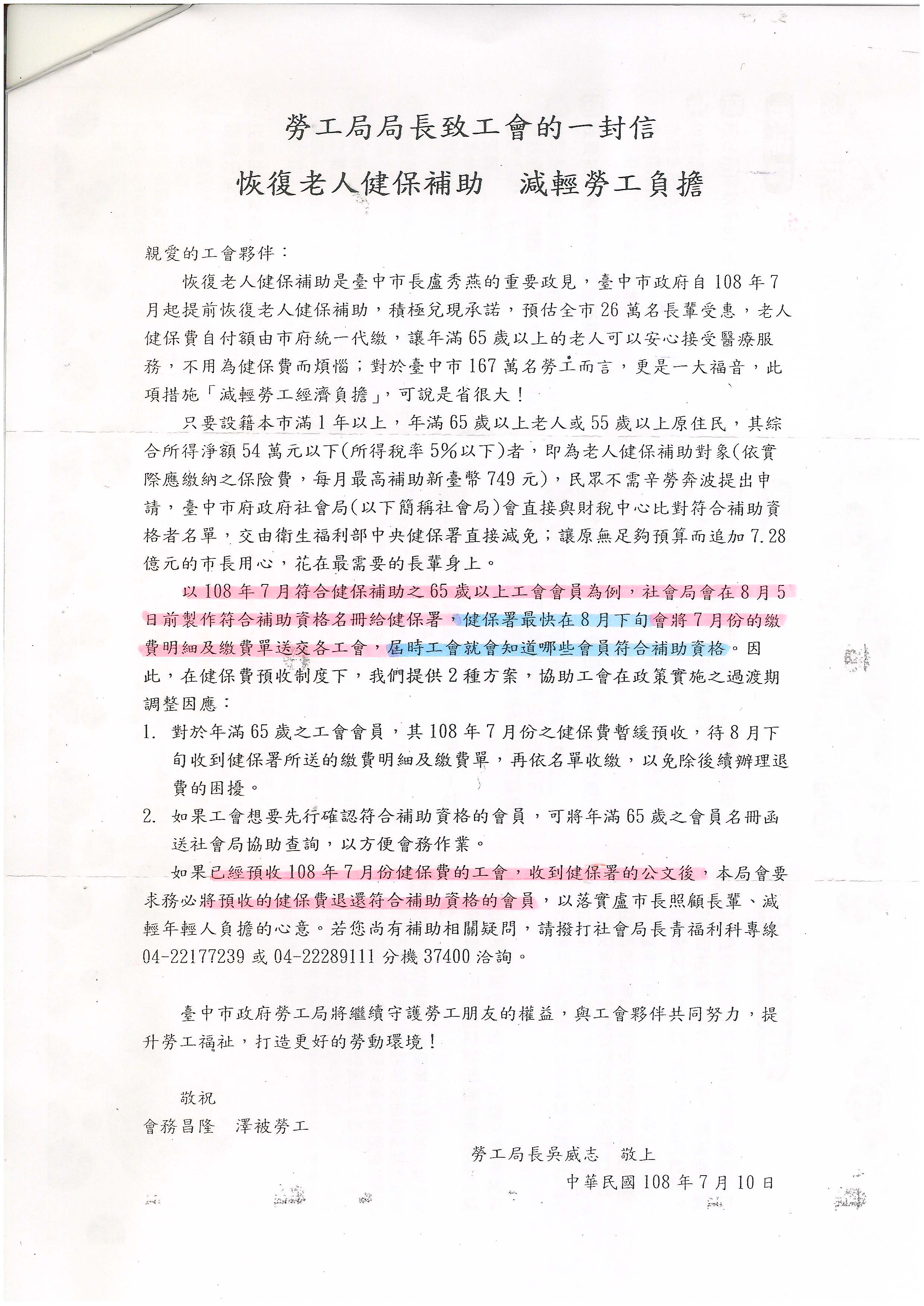 > 有關臺中市政府108年7月起恢復老人健保補助案