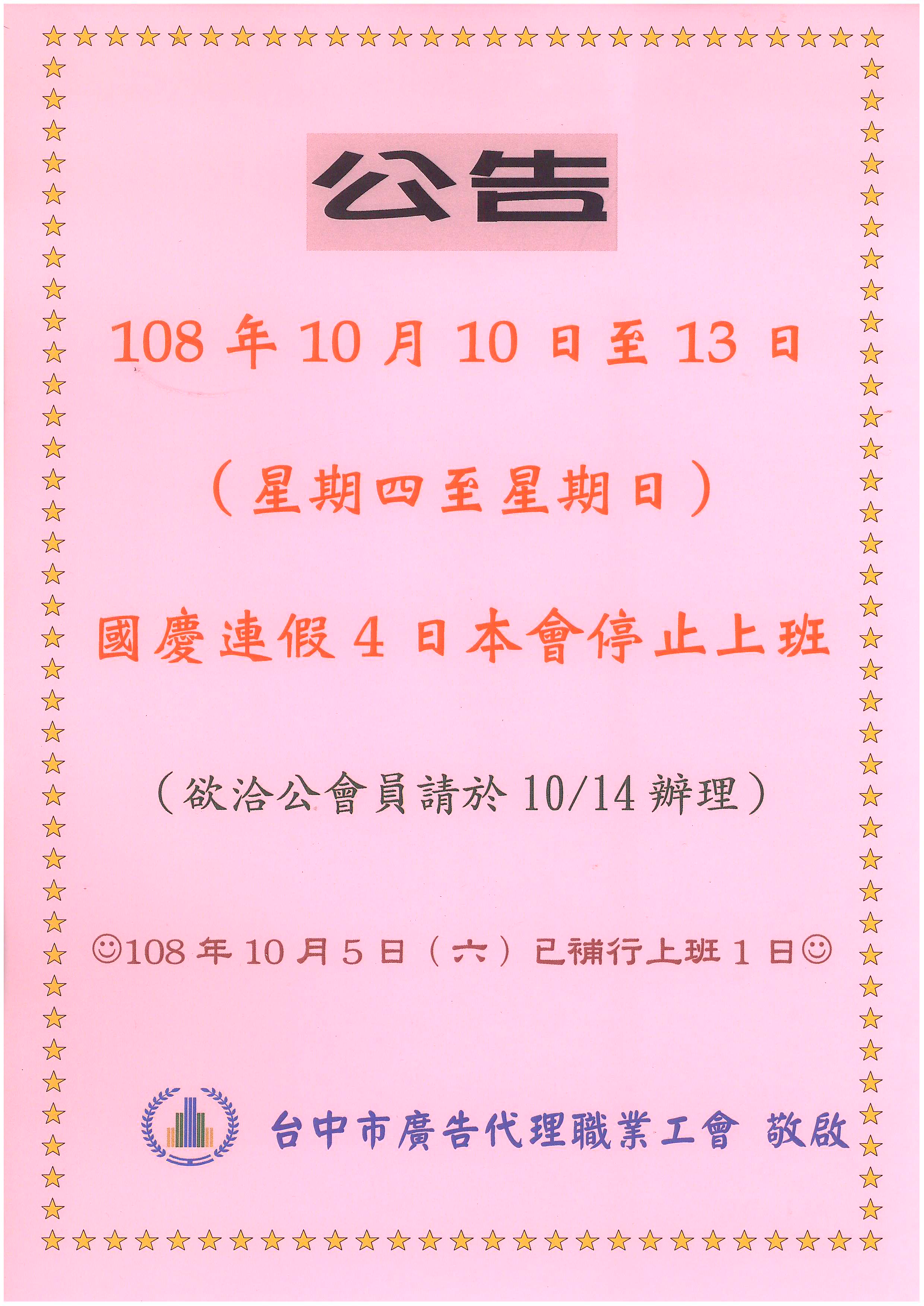 108年10月10日-10月13日國慶連假~工會停止上班!!
