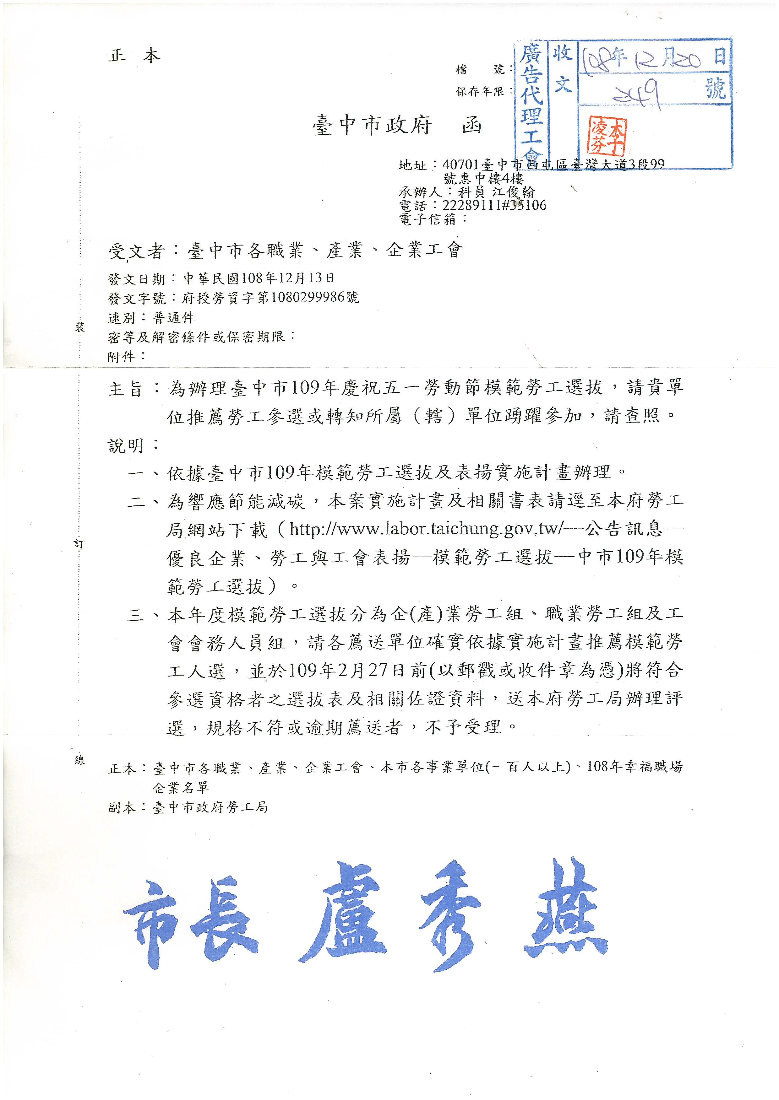 函轉~臺中市政府辦理『109年度慶祝五一勞動節模範勞工選拔』