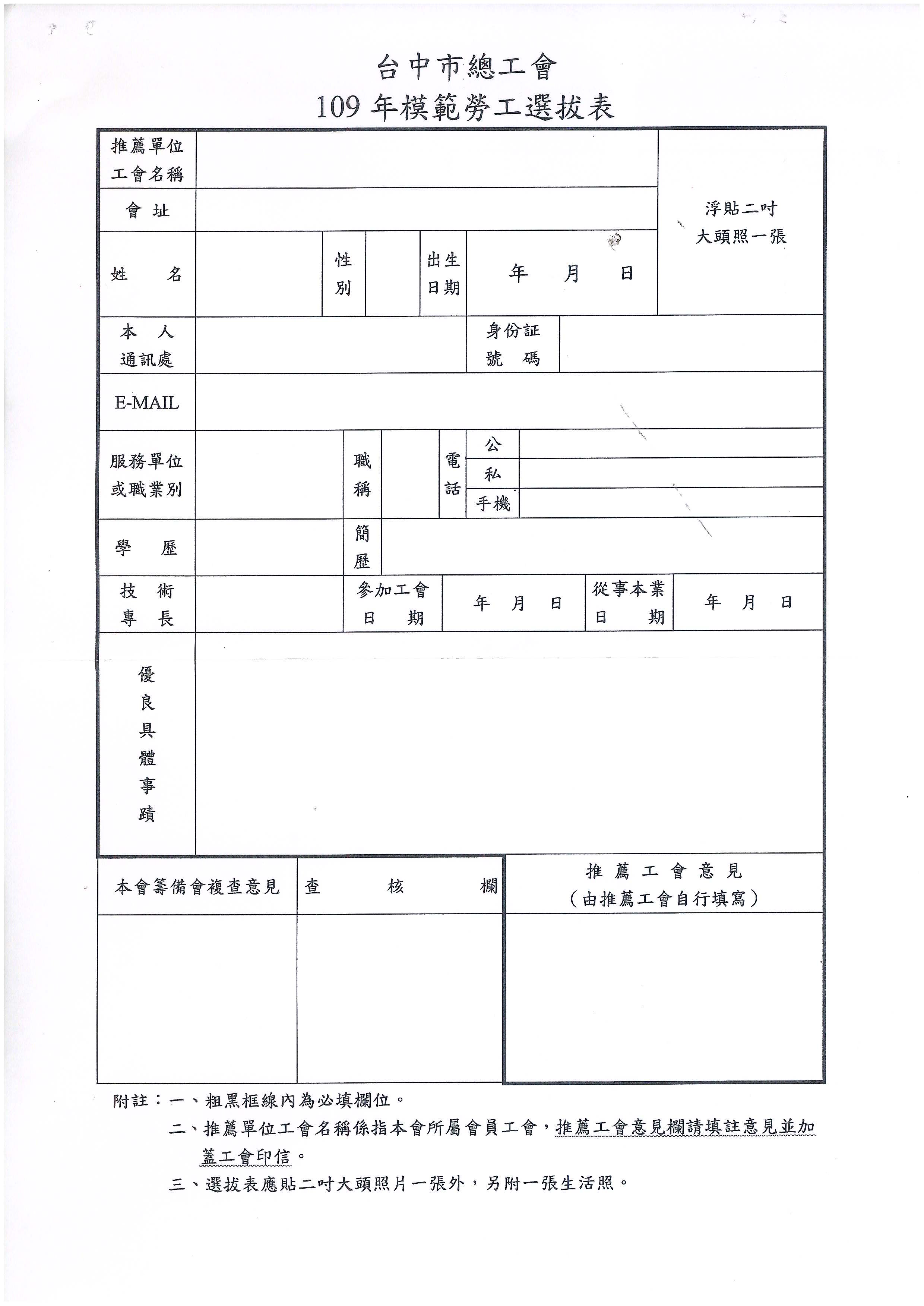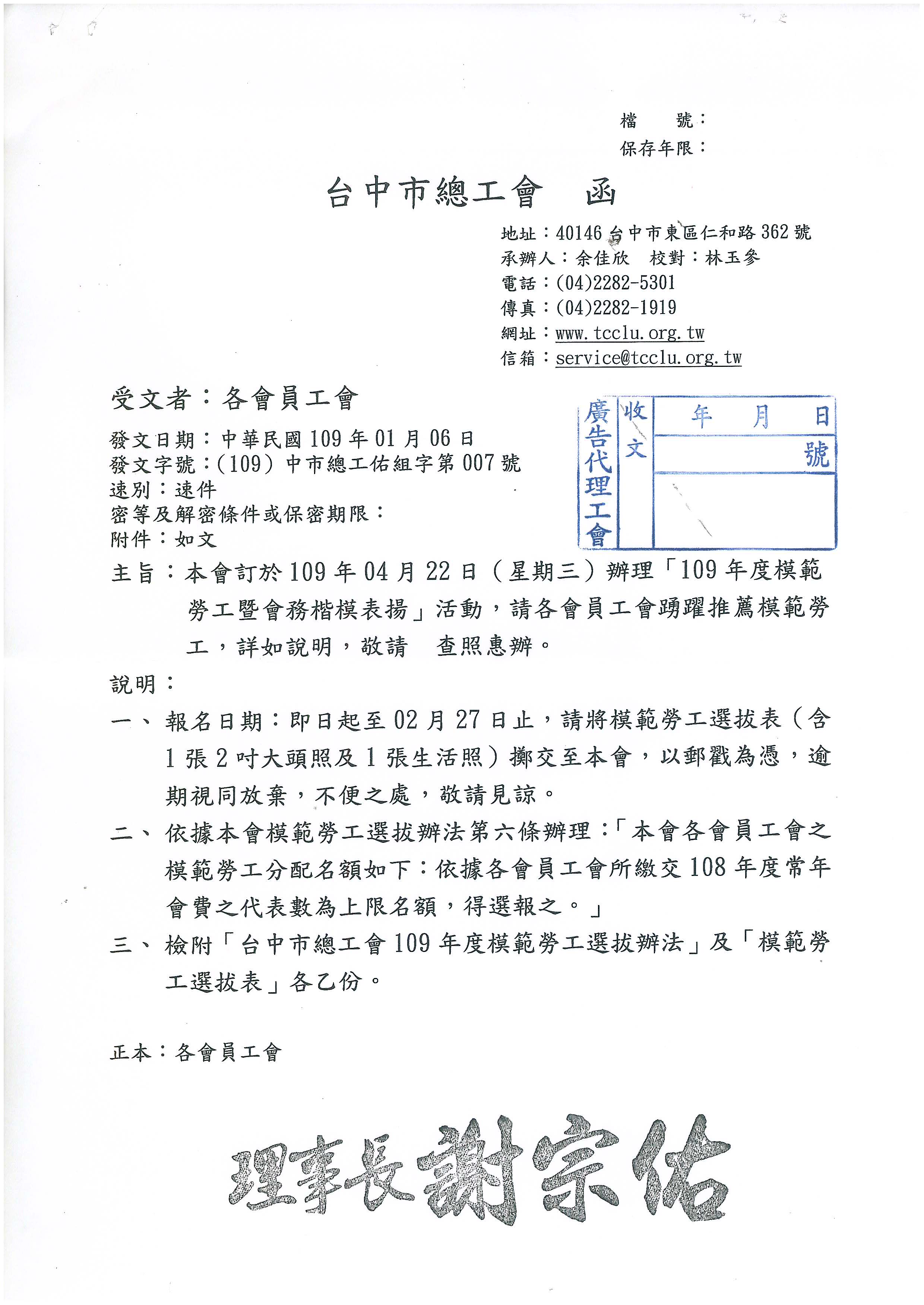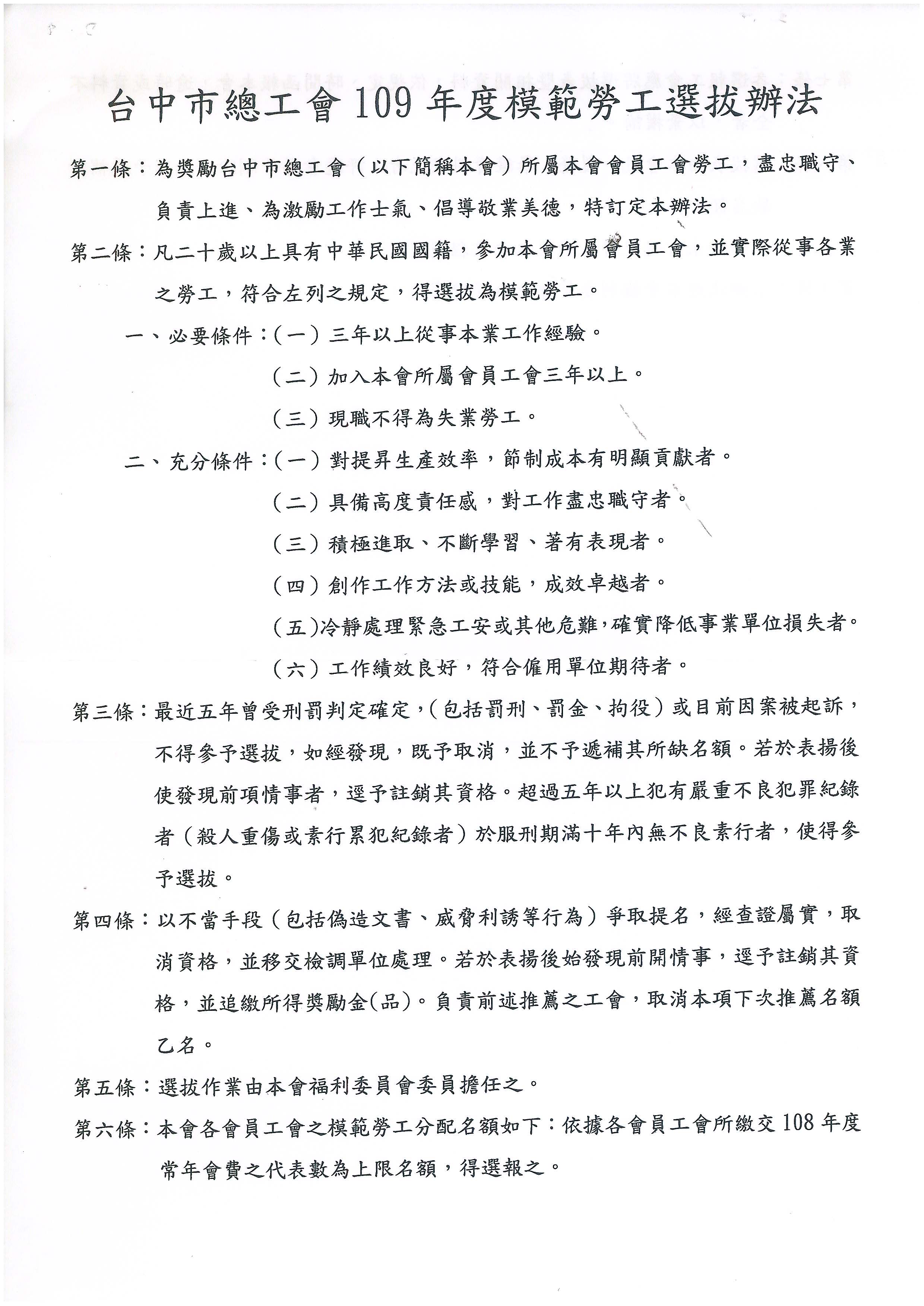 函轉~台中市總工會辦理『109年度模範勞工暨會務楷模表揚』活動