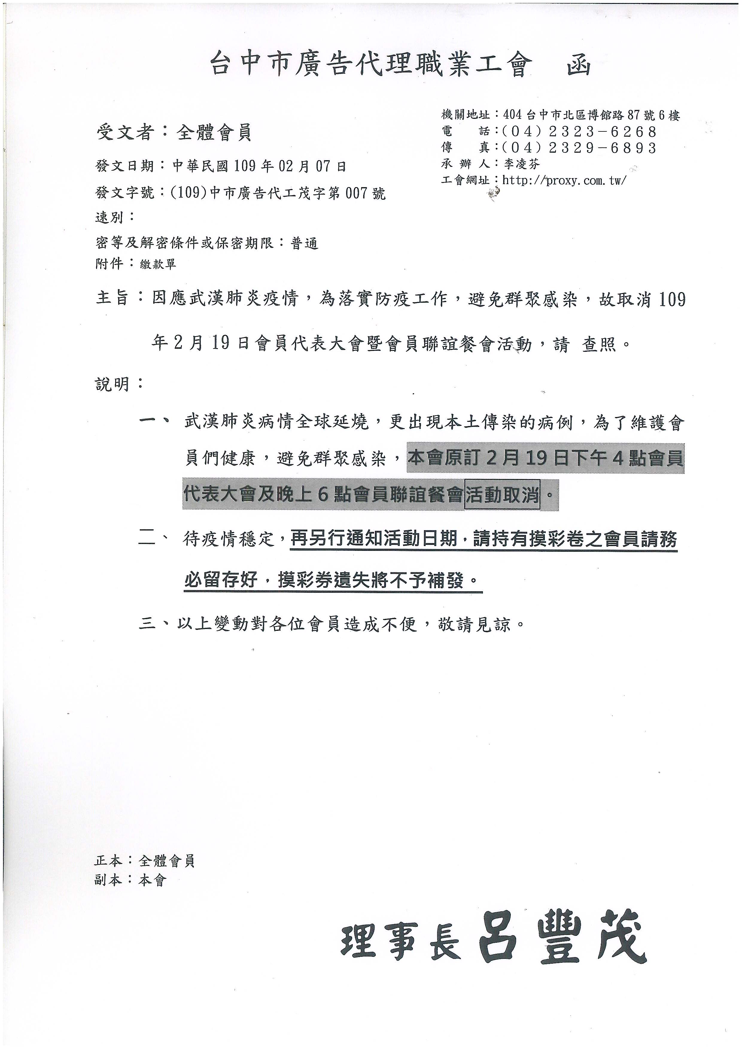 公告全體會員:本會暫時取消109.2.19代表大會暨會員聯誼餐會
