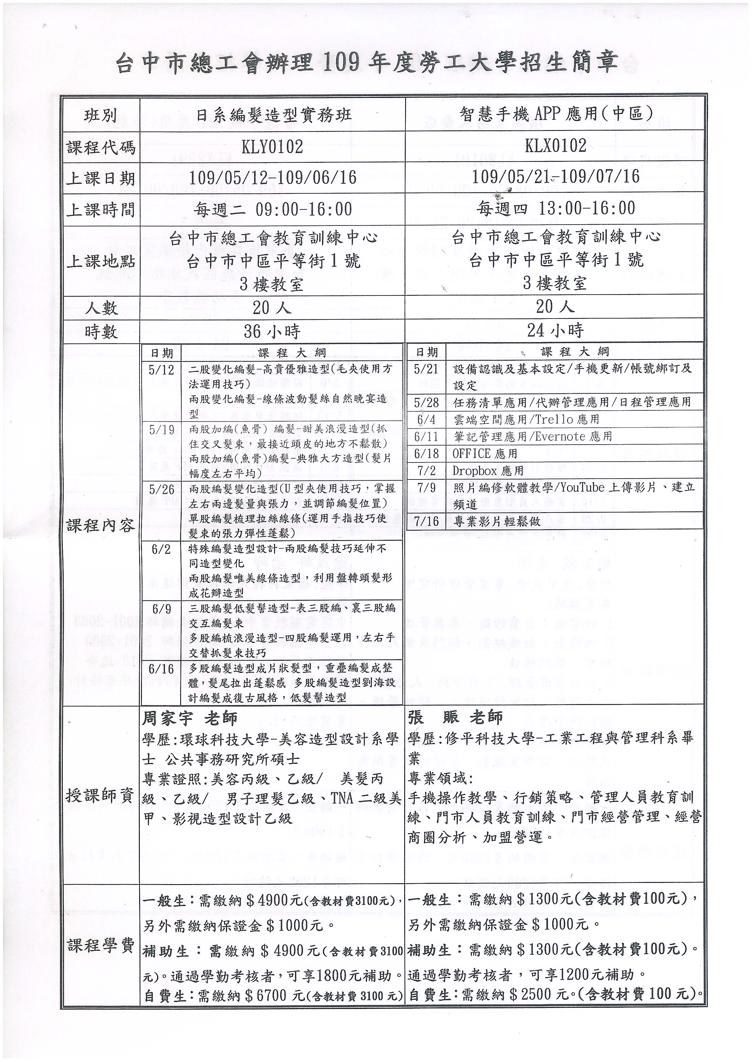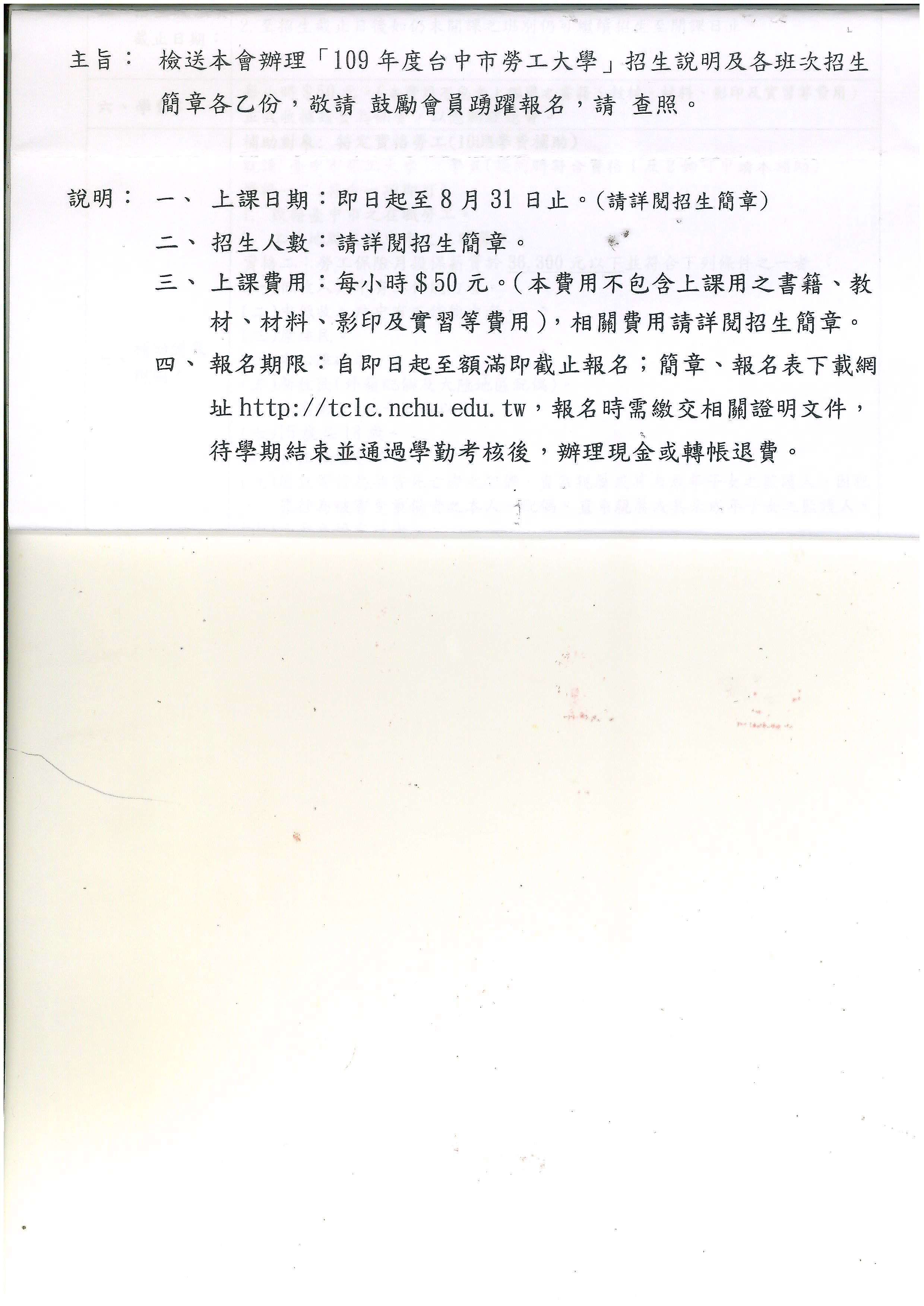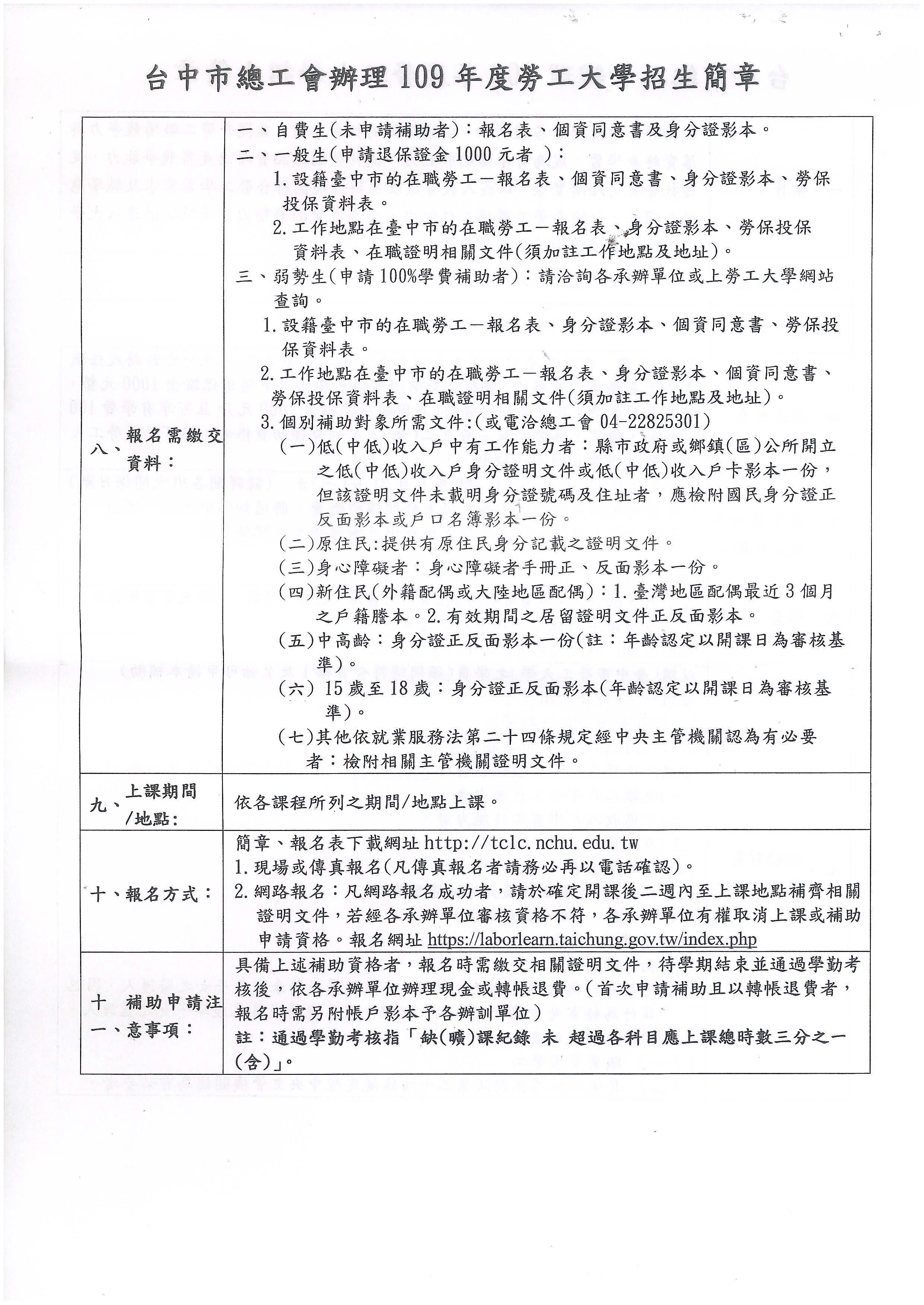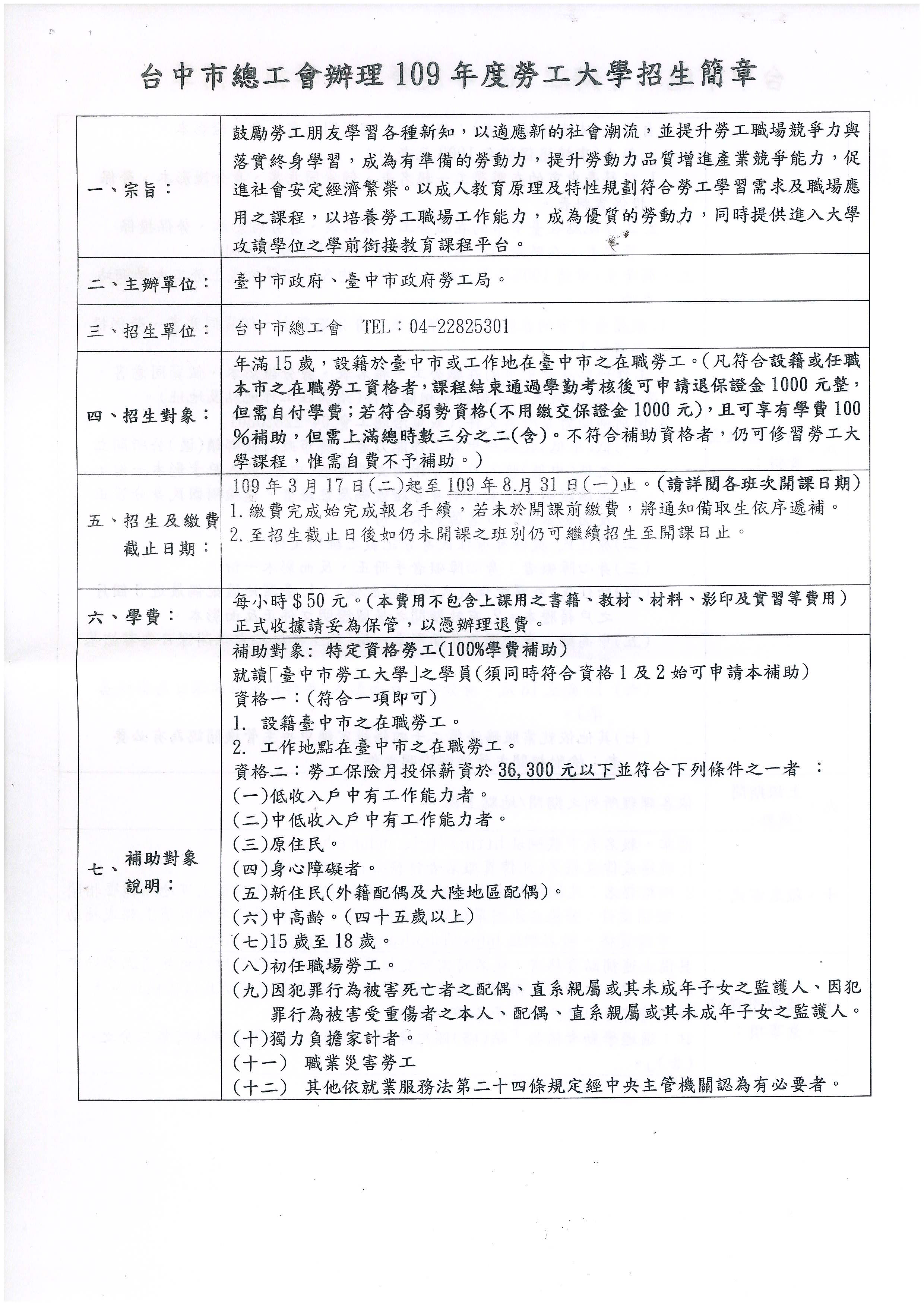 函轉~台中市總工會辦理(109年度台中市勞工大學)招生說明及簡章