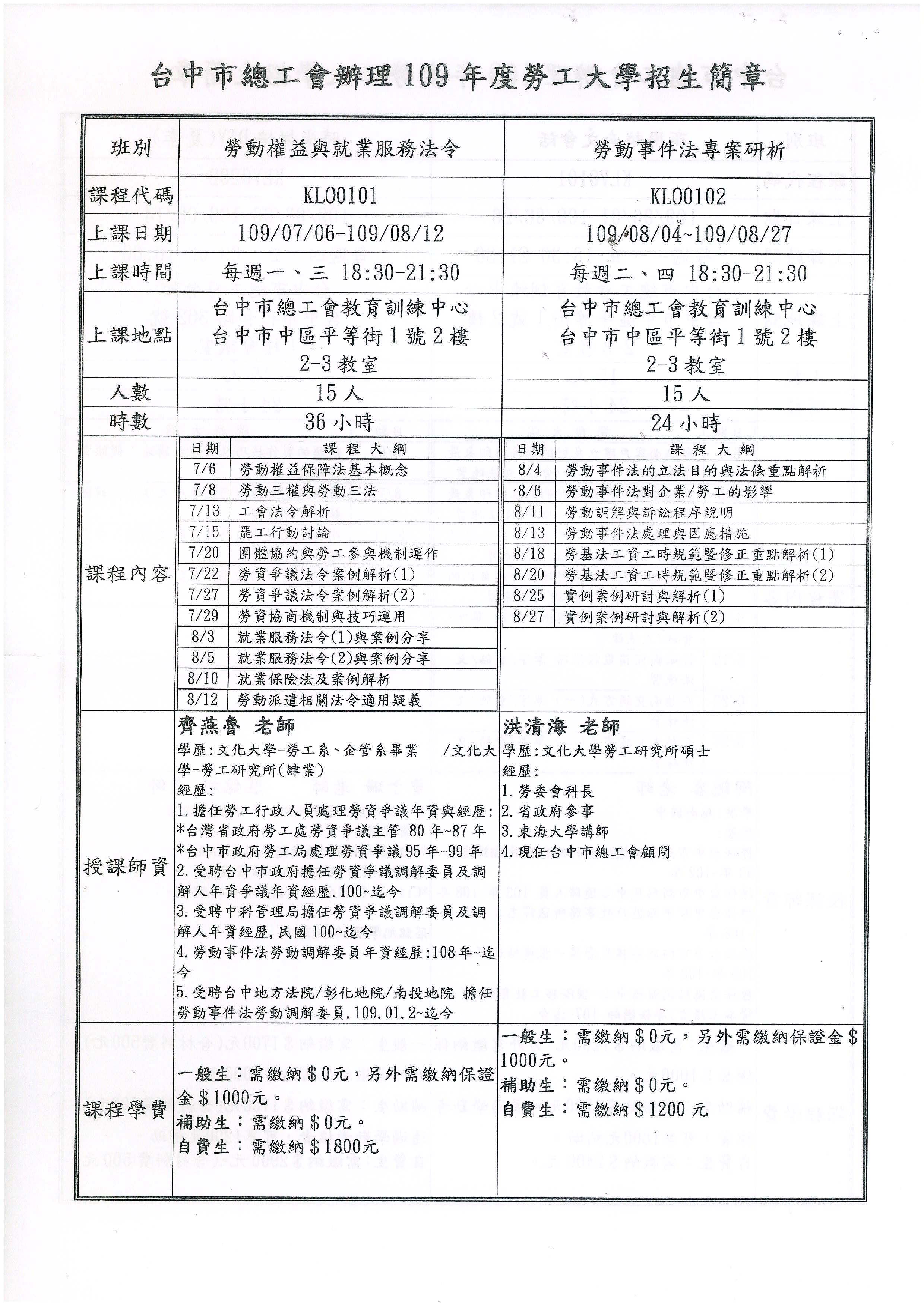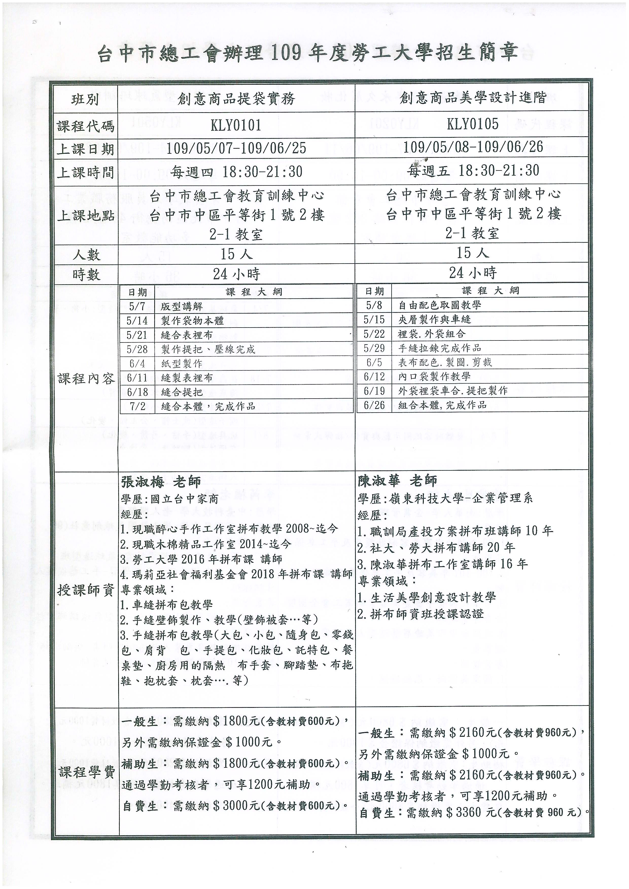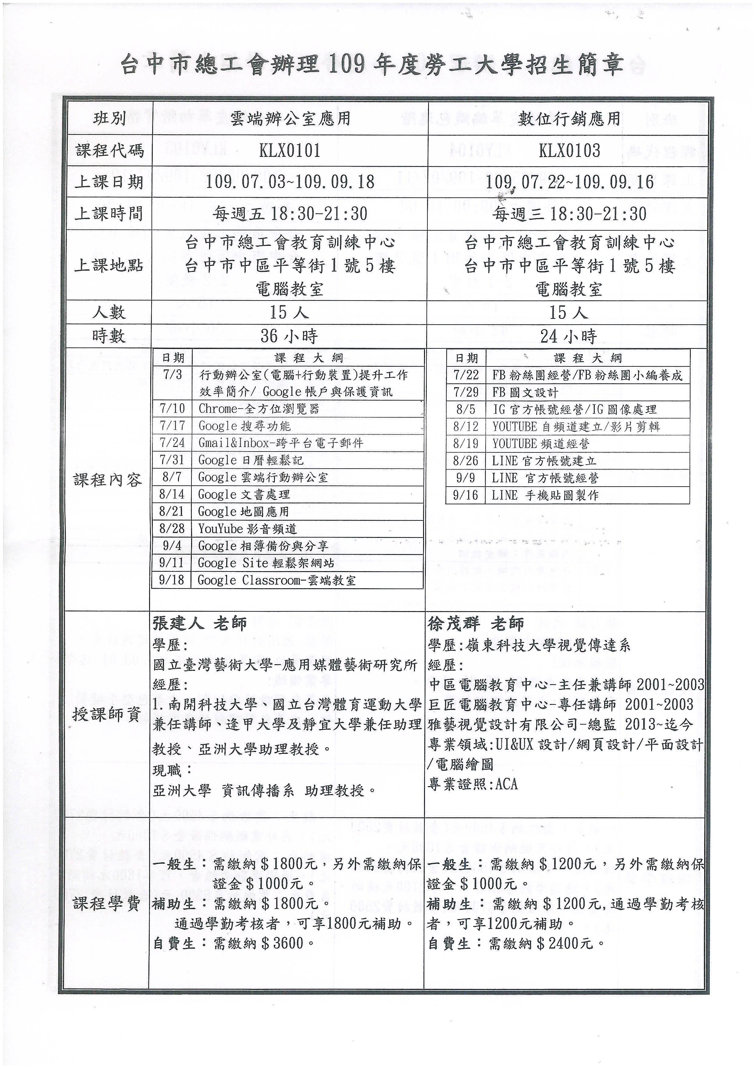 函轉~台中市總工會辦理(109年度台中市勞工大學)招生說明及簡章