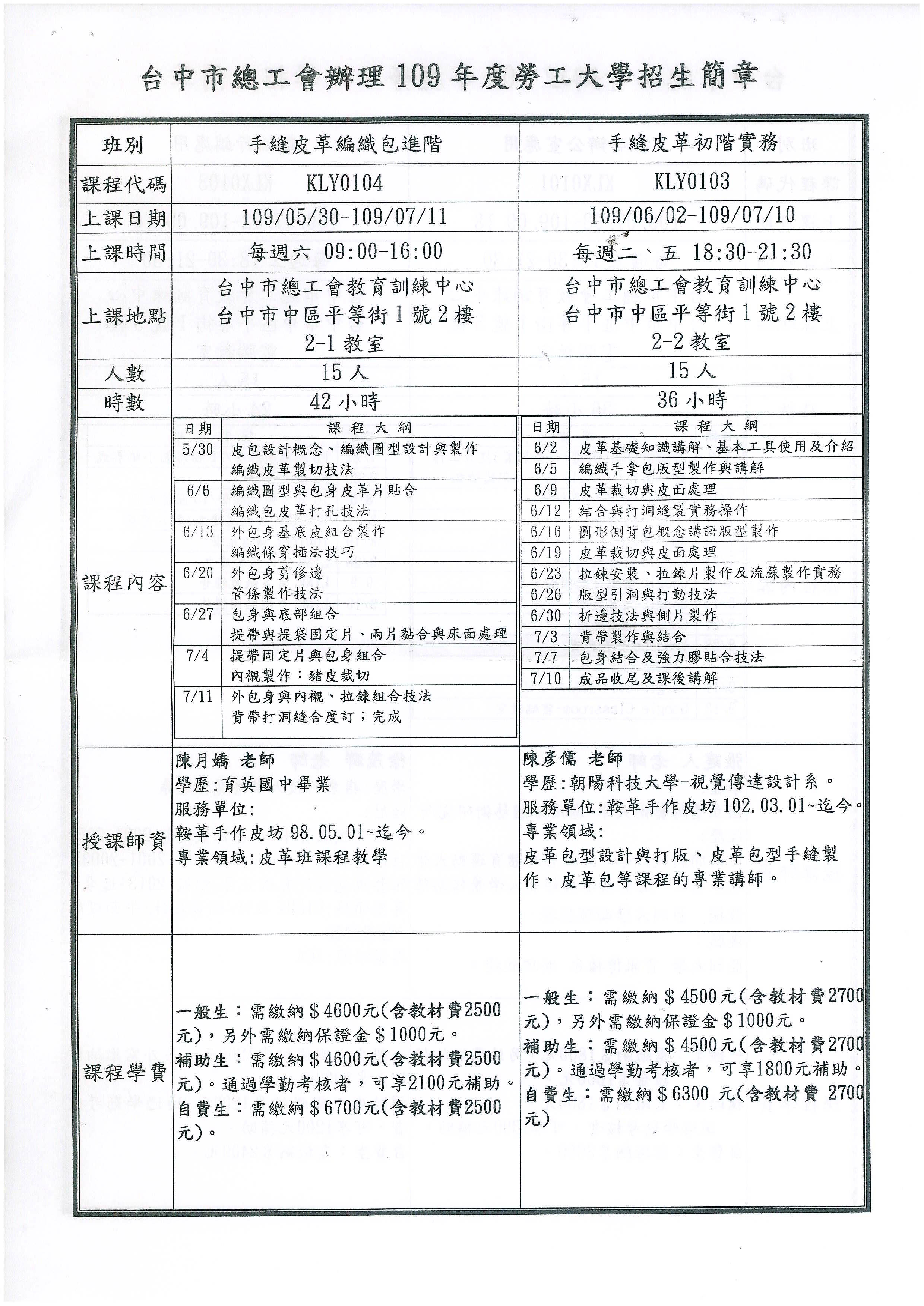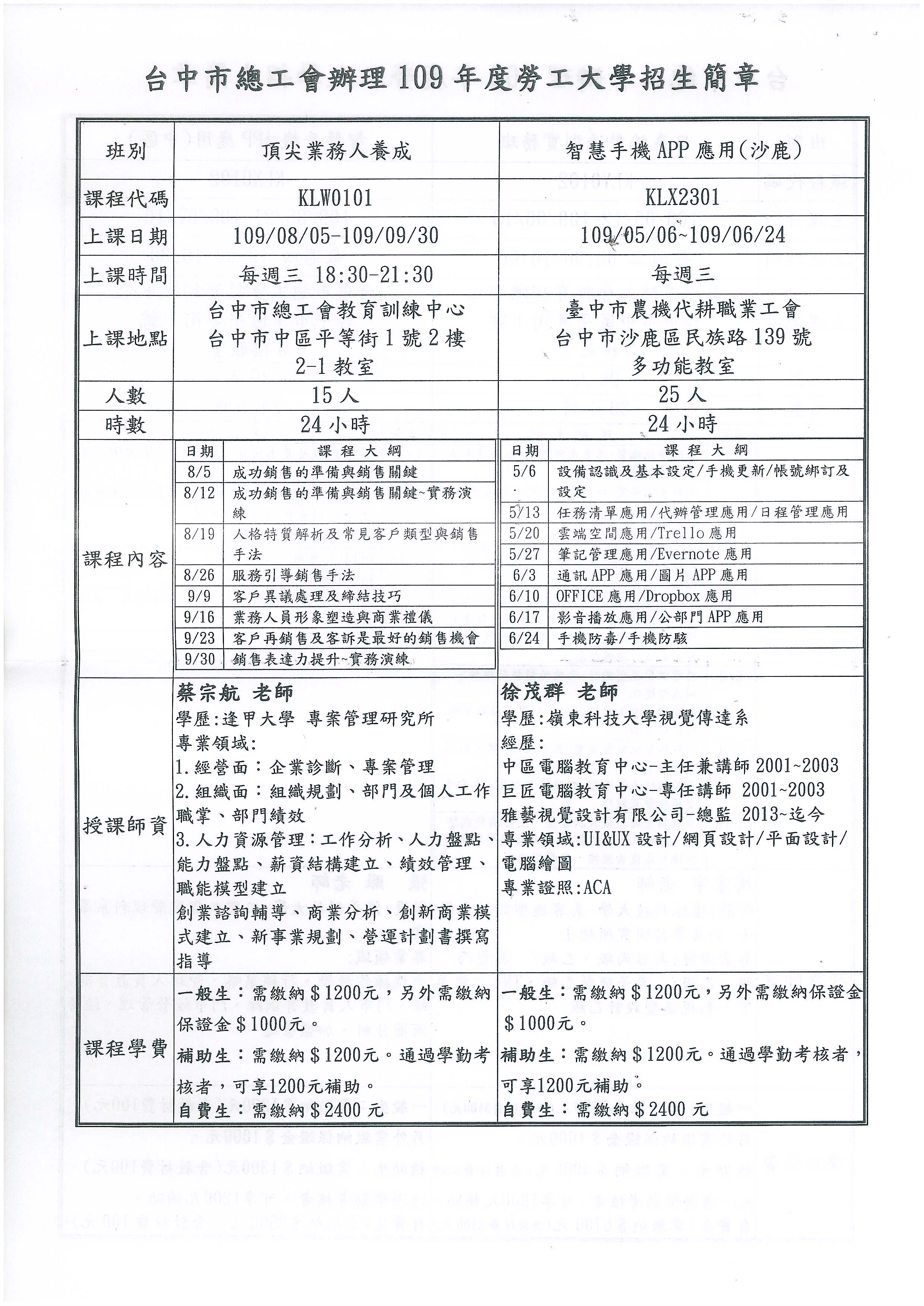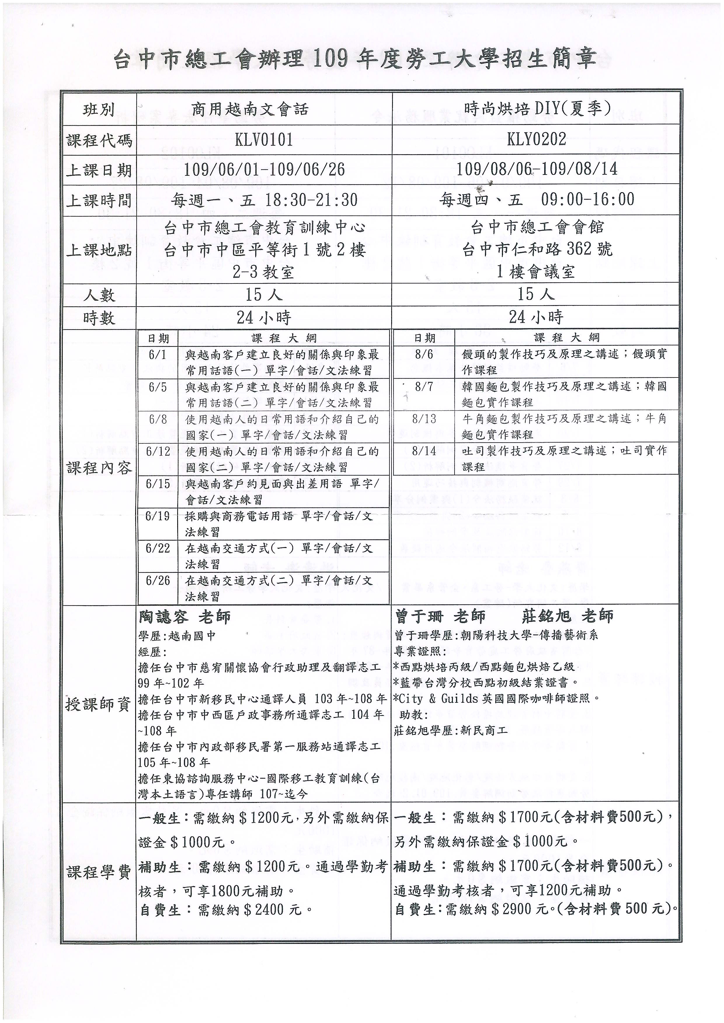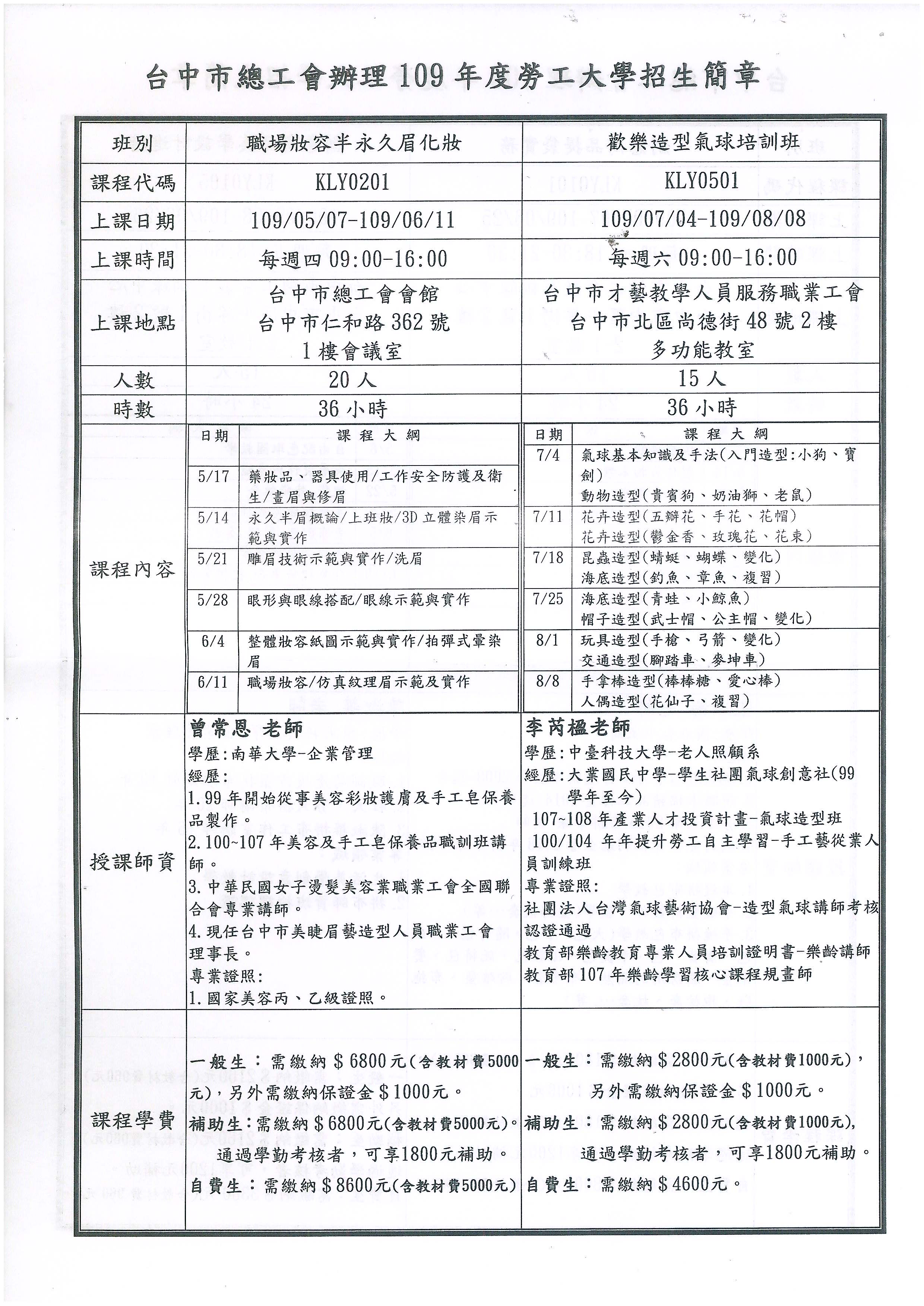 函轉~台中市總工會辦理(109年度台中市勞工大學)招生說明及簡章