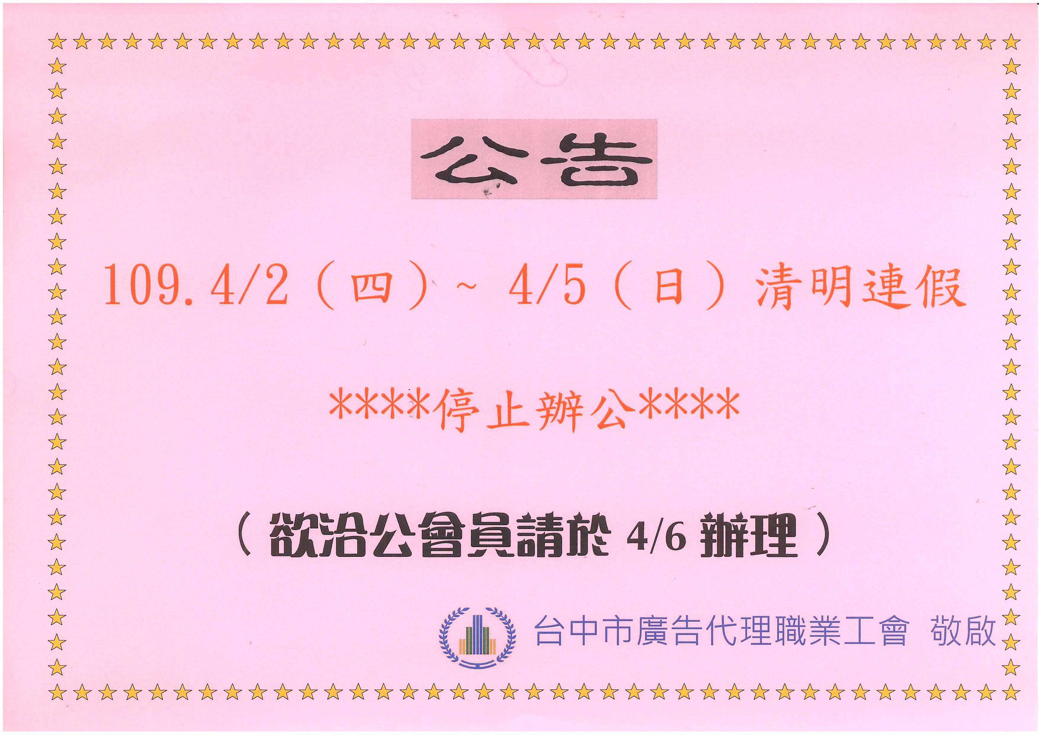 > 109.4/2(四)-4/5(日)清明連假~工會停止上班