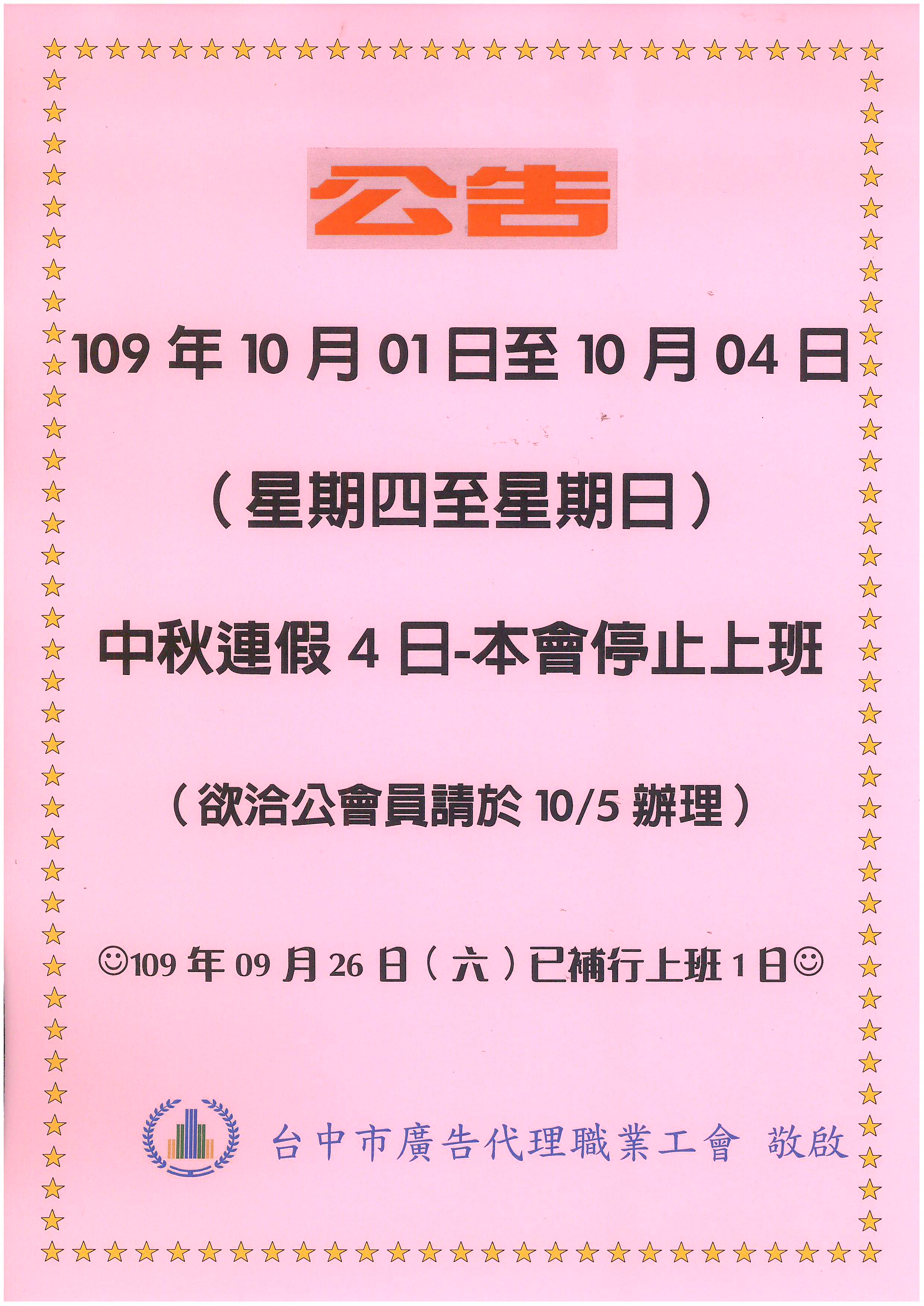 109.10/1(四)-10/4(日)中秋連假~工會停止上班