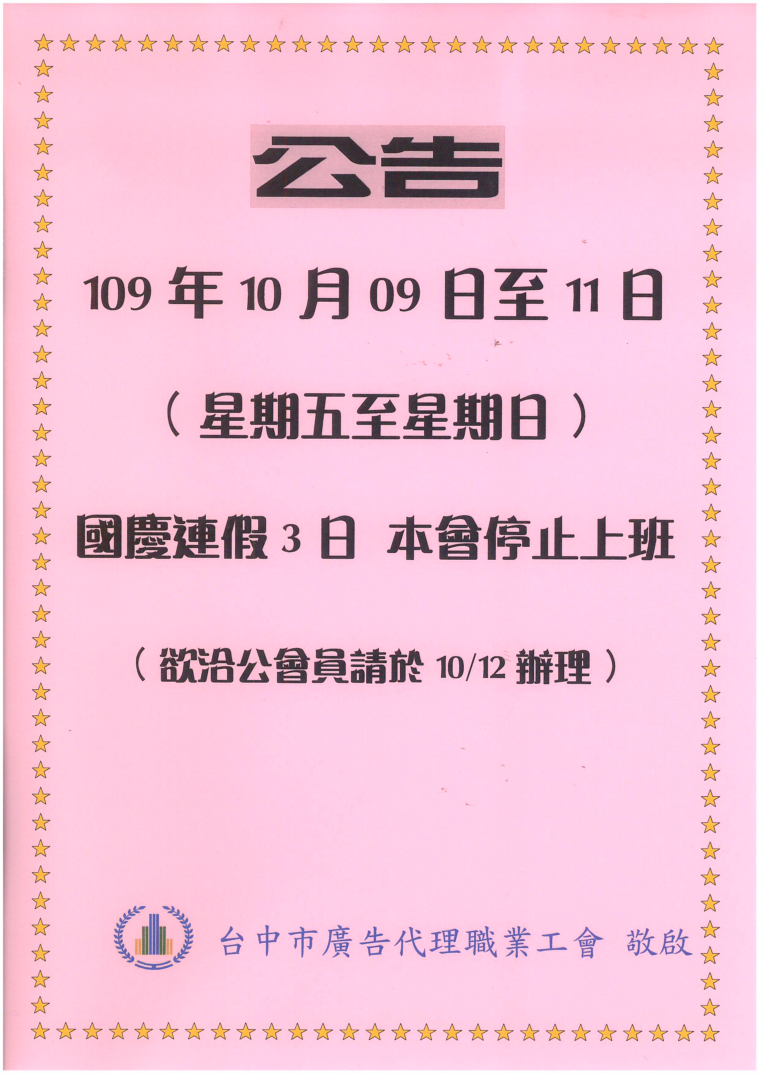 109年10月09日-10月11日國慶連假~工會停止上班!!