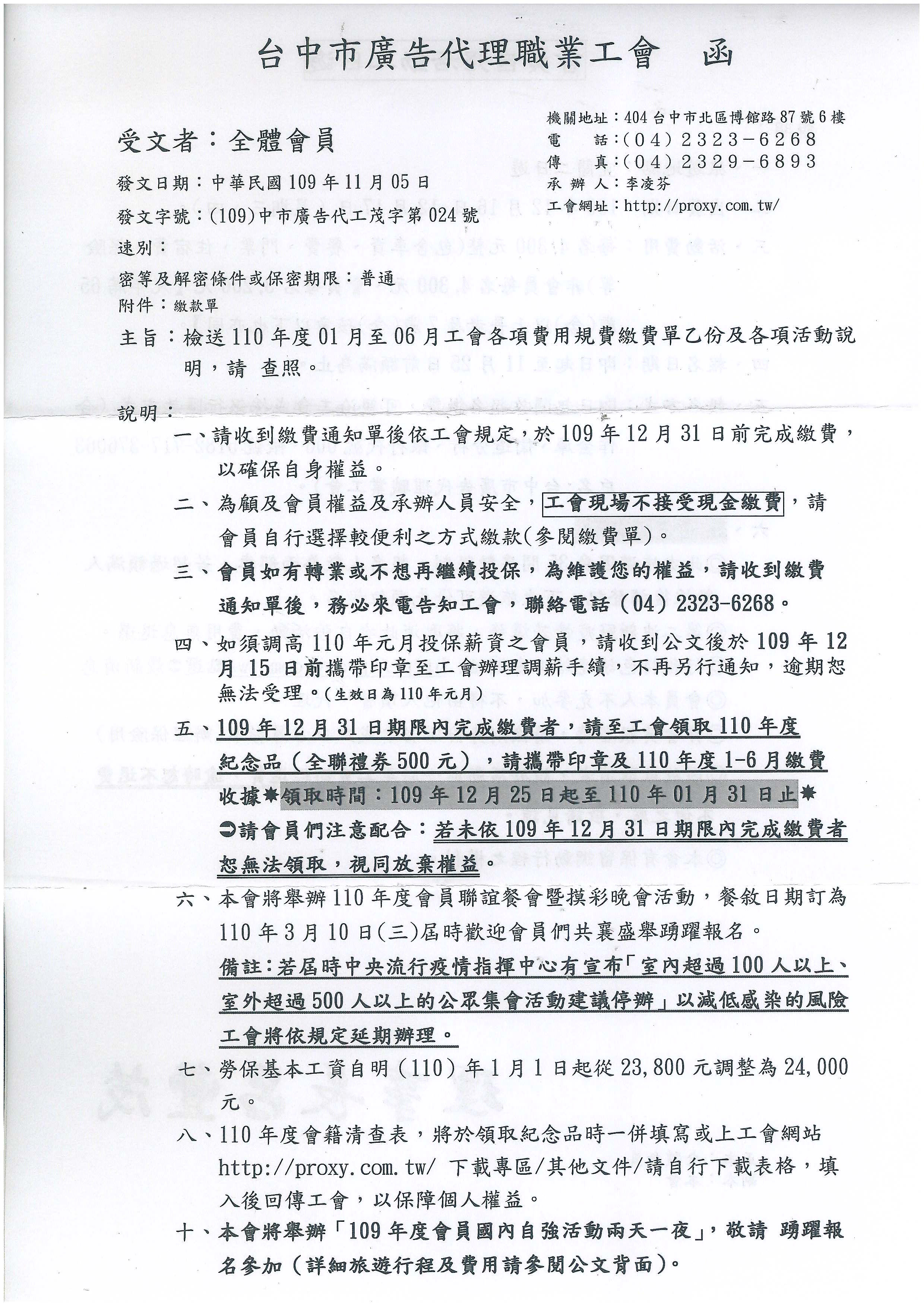110年1-6月各項繳費單及自強活動通知公文已寄出,請會員們詳閱!!