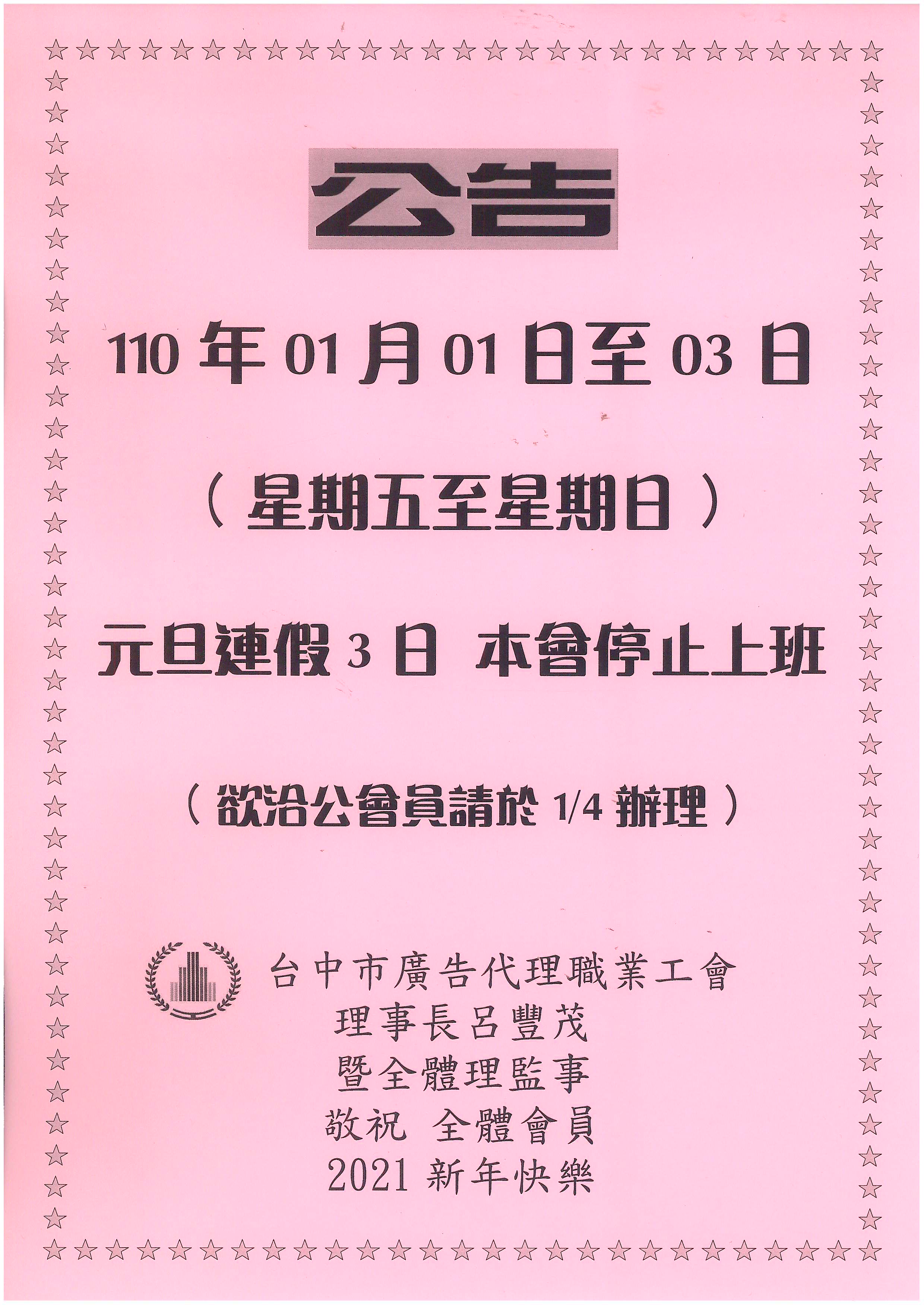 > 110年月1日-1月3日元旦連假~工會停止上班!!