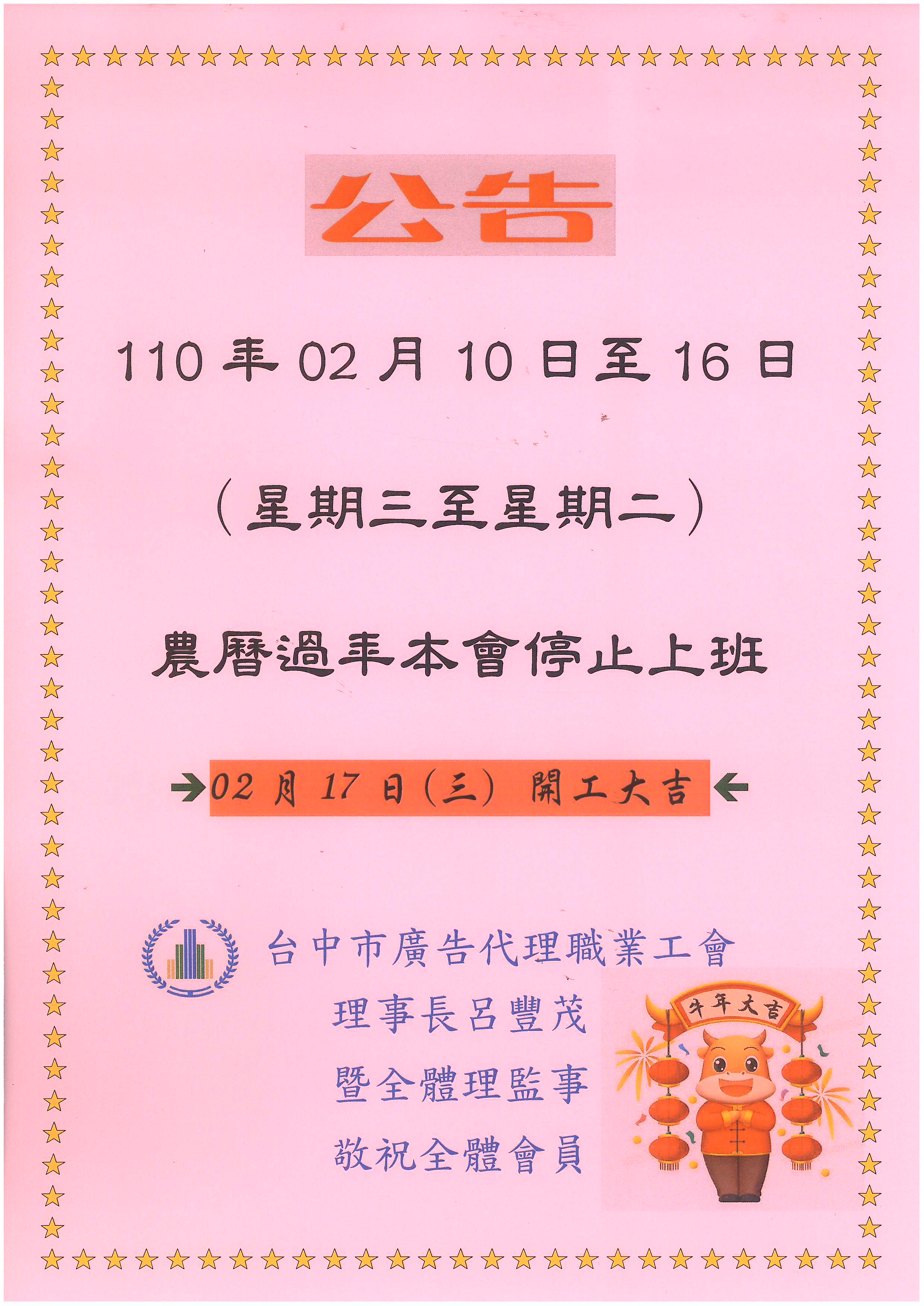 > 110.2.10-2.16農曆過年連假~工會停止上班