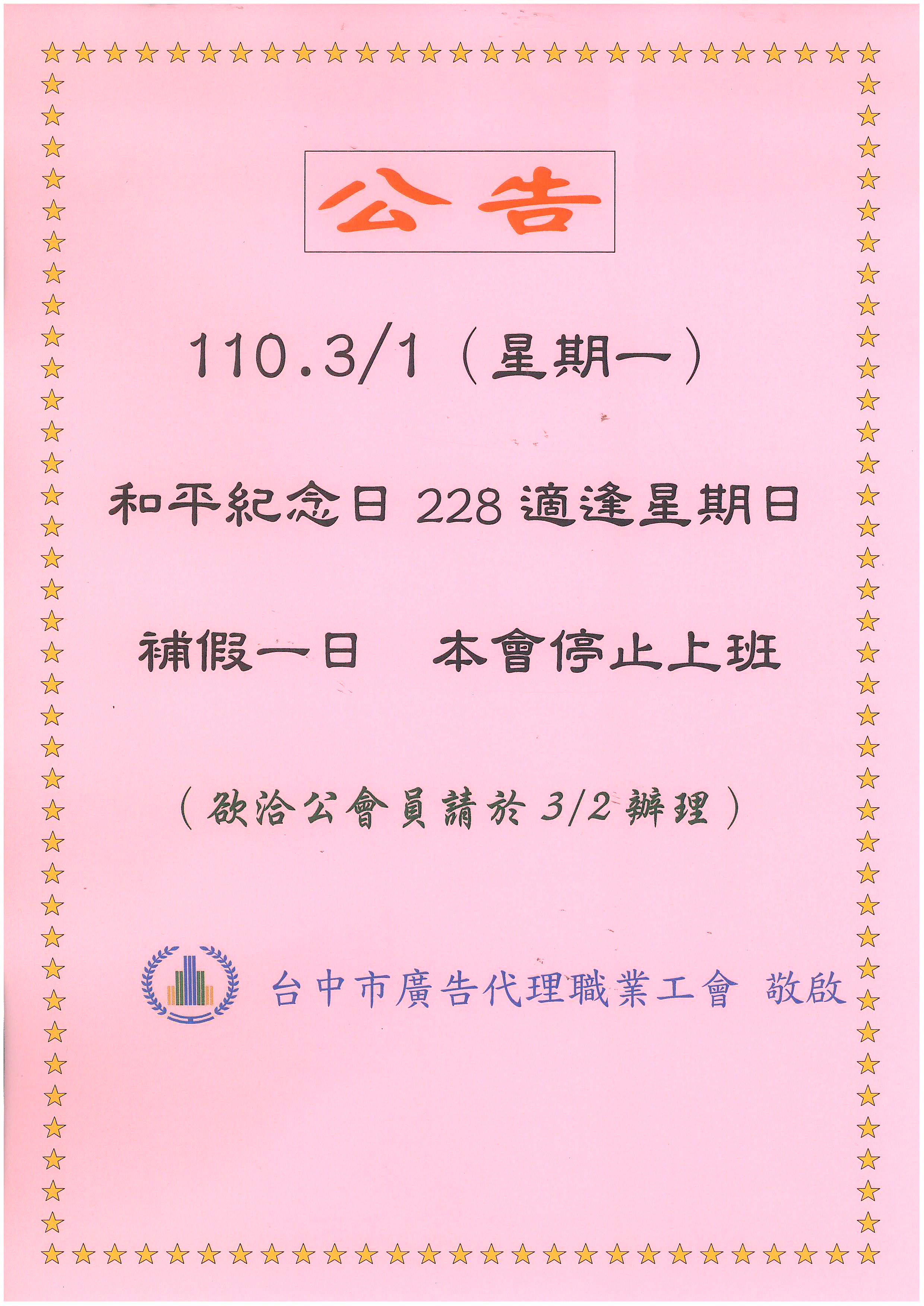 和平紀念日228適逢星期日.3/1(一)補假一日~停止上班!!