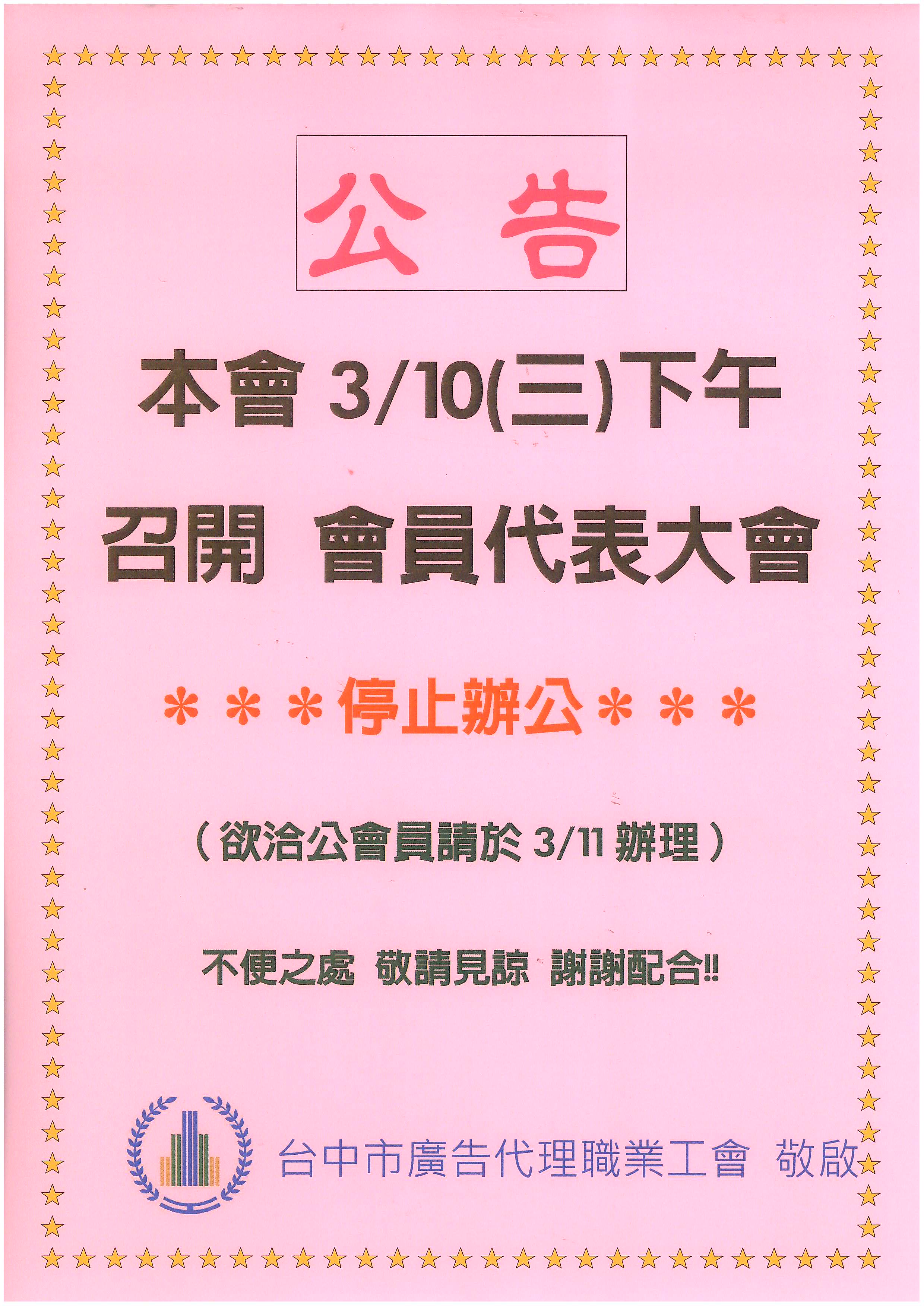 > 110.3.10(三)下午召開第9-1次會員代表大會~停止上班!!