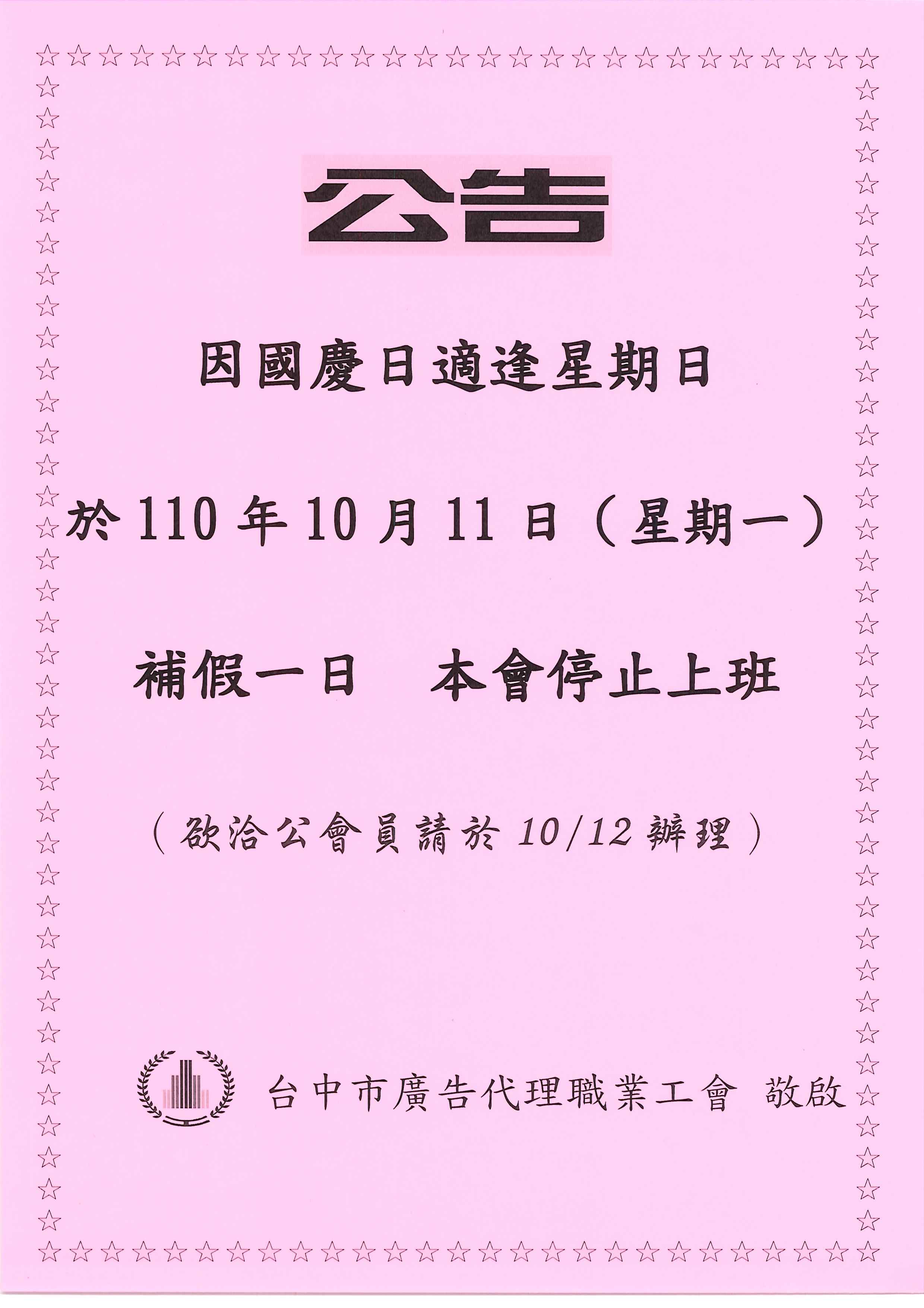 110年10月11日國慶補假~工會停止上班!!
