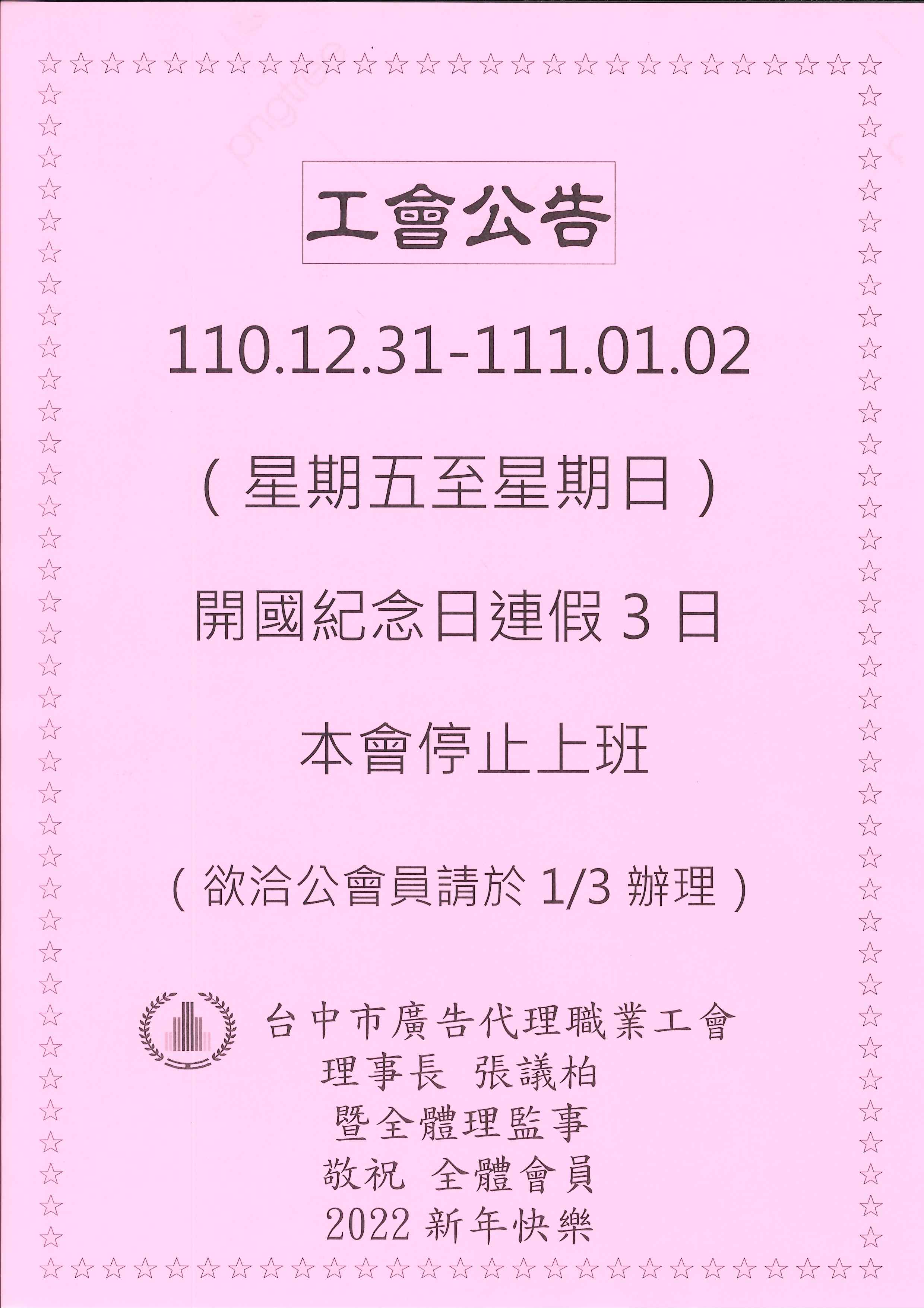 > 110.12.31(五)-111.1.2(日)開國紀念日~工會停止上班