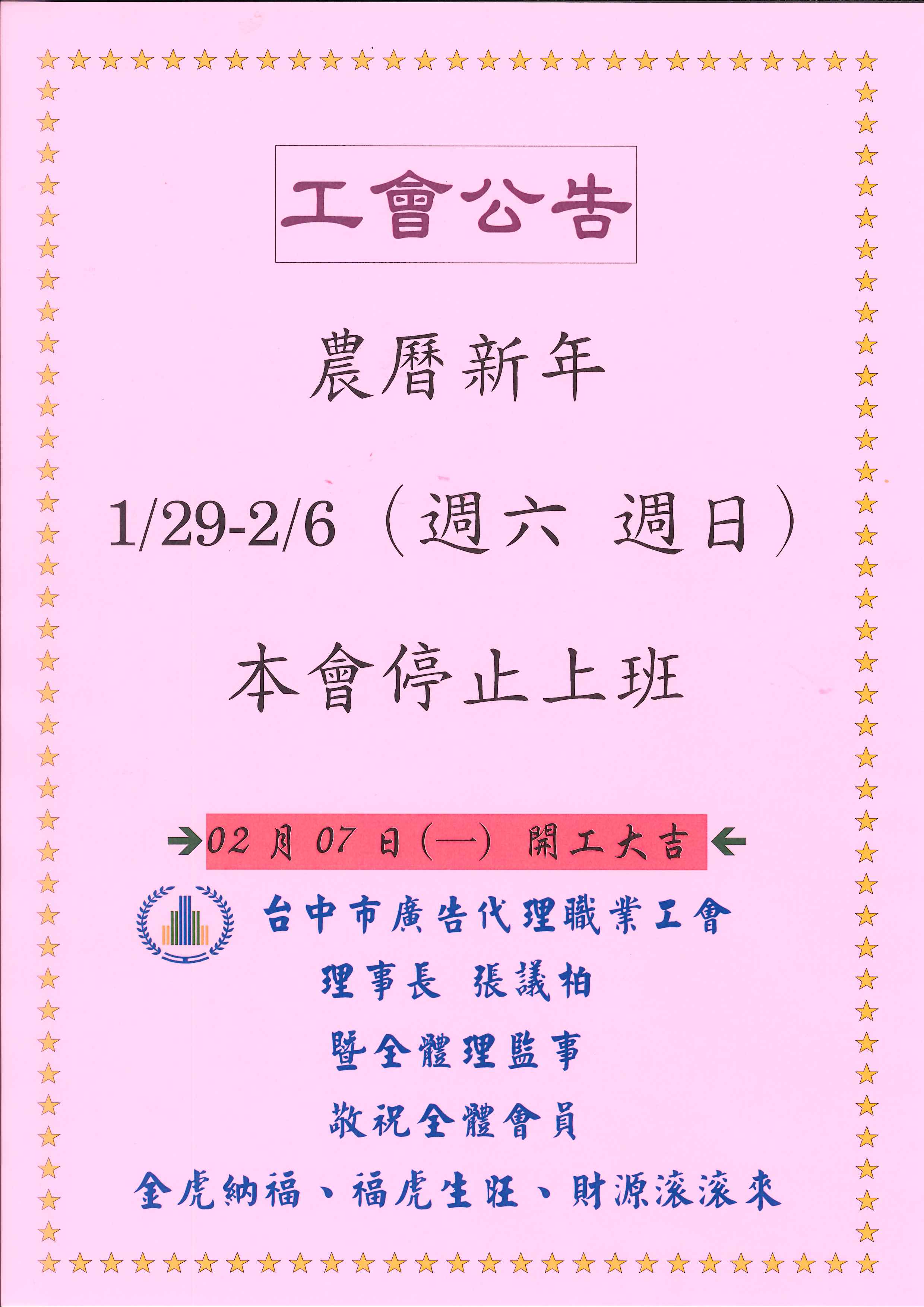 1/29-2/6農曆新年~工會停止上班