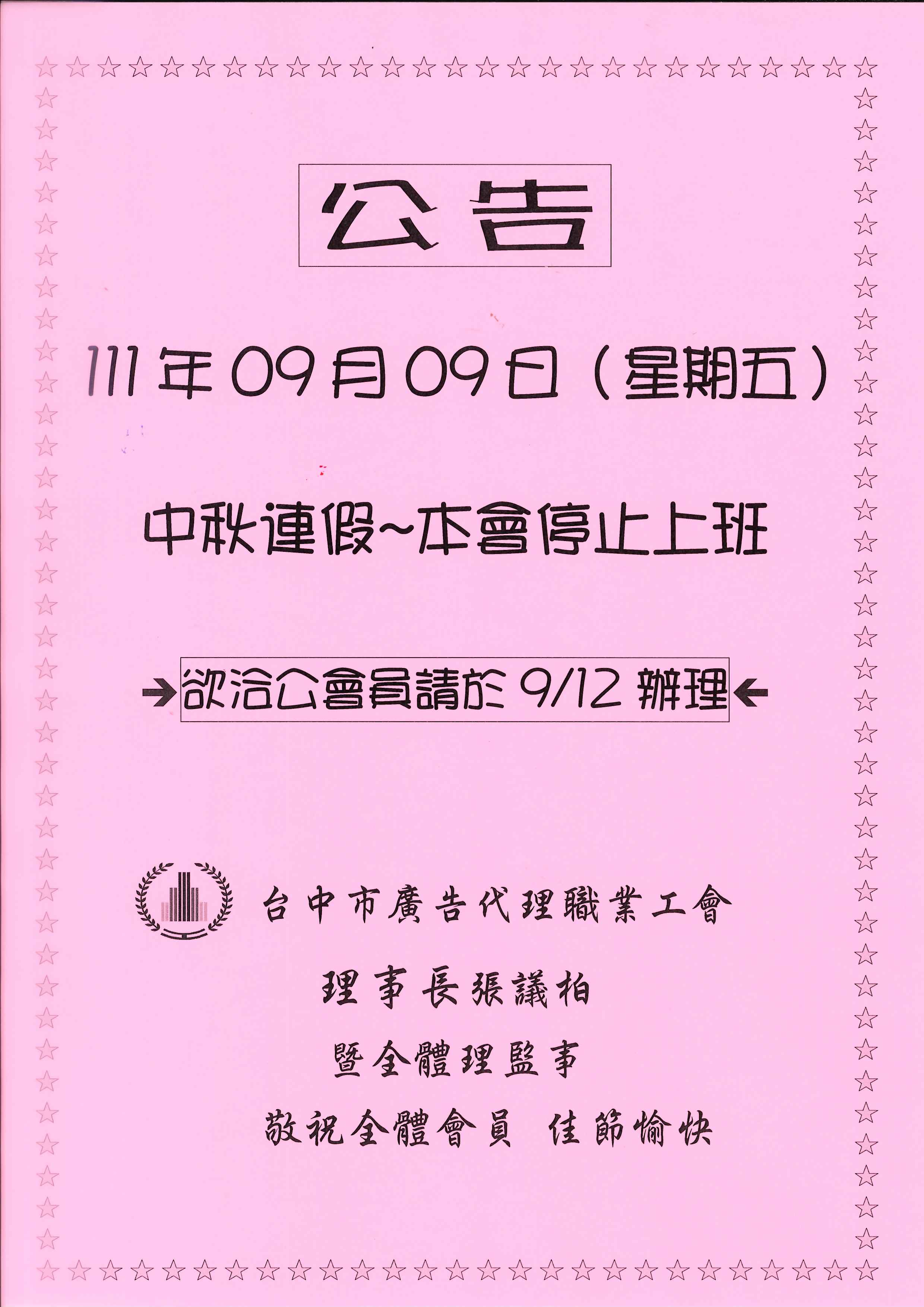 111.9/9(五)中秋連假~工會停止上班