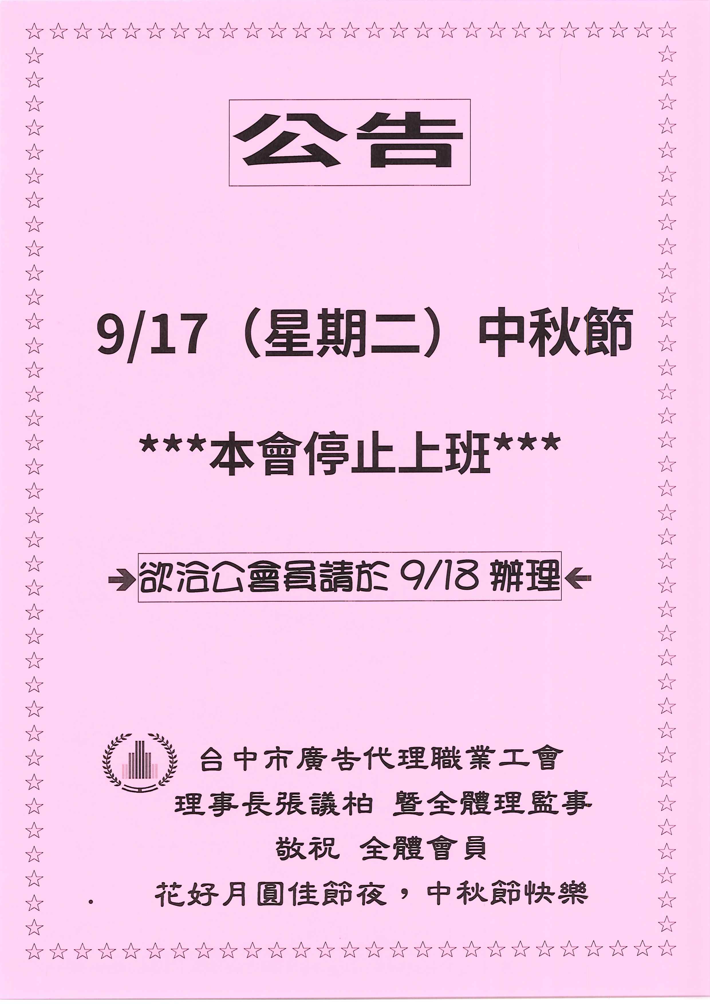 113.9.17(二)中秋節~工會停止上班
