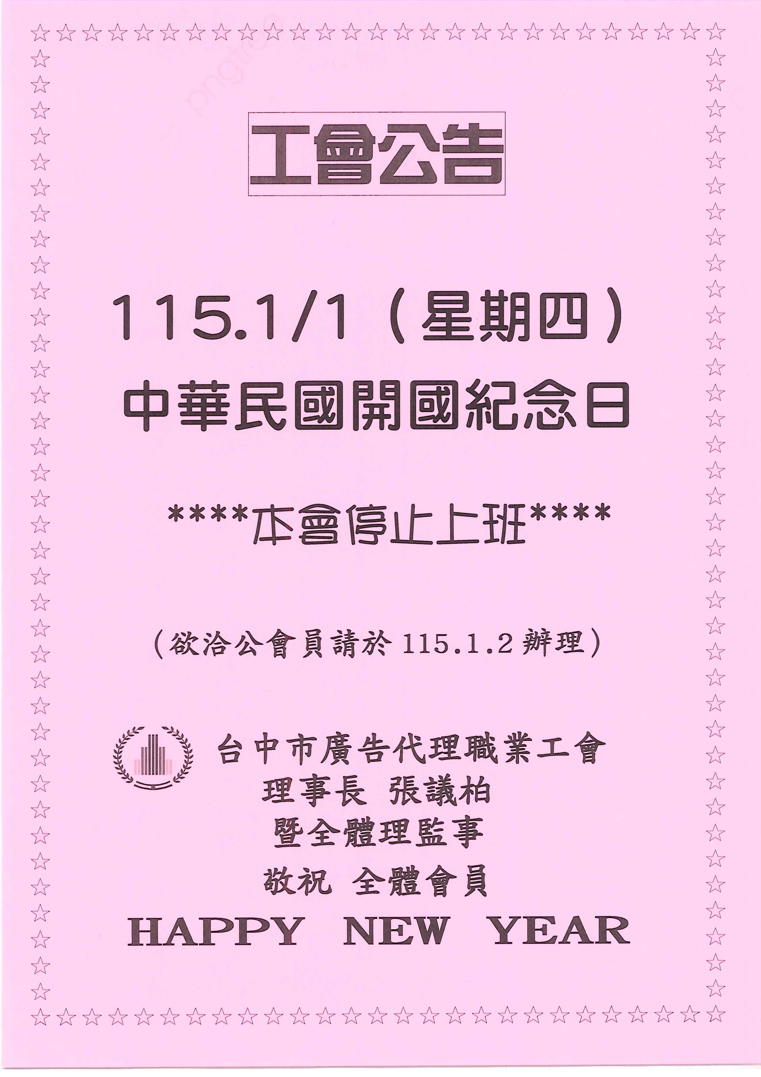 > 📢115.01.01中華民國開國紀念日~停止上班