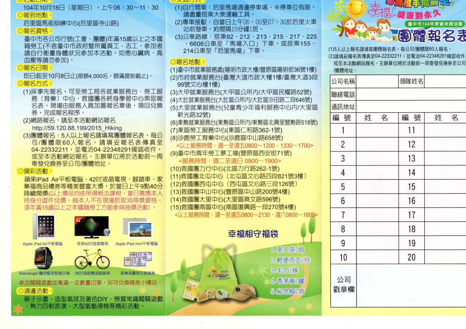 主旨:勞工局訂於104年10月18日(日)上午6:30假后里區馬術訓練中心健行活動,活動採事先報名,報名日期8/24-10/8止(限額4000名,額滿提前截止),會員們請電洽04-22074868由工會團體報名,敬請會員們踴躍報名參加!!