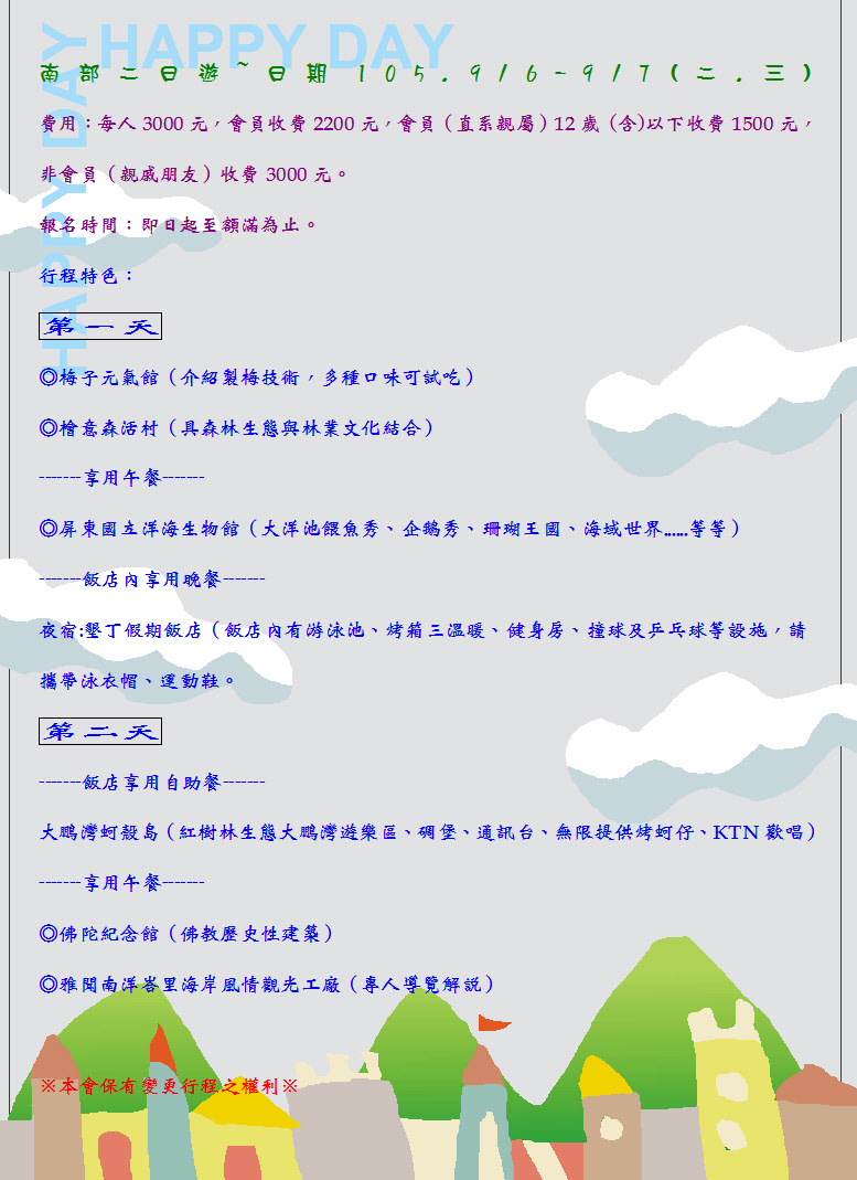 更新105年度會員自強活動二日遊行程表,敬請會員踴躍參加~