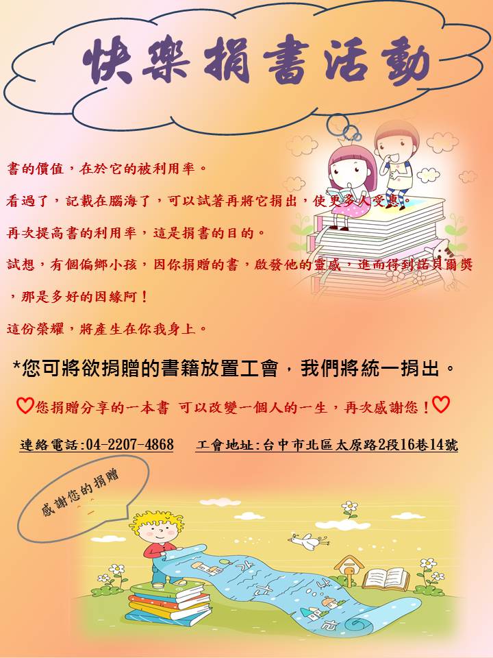 > 敬邀全體會員們:一同參與工會捐書送愛、幫助偏鄉孩子因閱讀改變生命之活動。